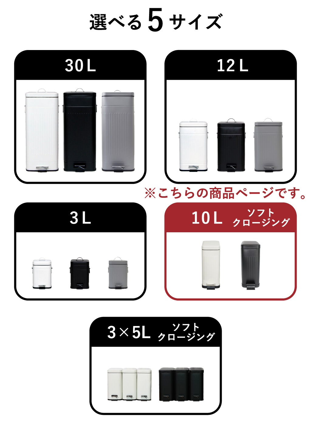 小さい蓋付きゴミ箱から大容量のゴミ箱まで、全5サイズをご用意しました。