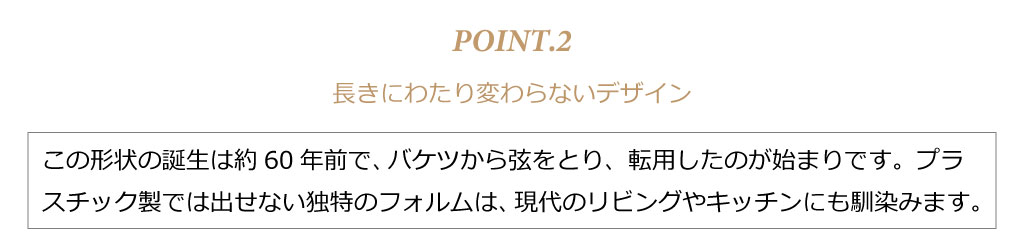 この形状の誕生は約60年前にも遡り、バケツから弦を取り、転用したことが始まりです。プラスチック製では出せない独特のフォルムは、現代のリビングやオフィス、キッチンにもよく馴染みます。