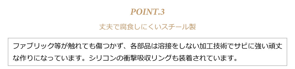 縁は滑らかに加工されているので、ファブリック等が触れても傷つかず、各部品は溶接をしない加工技術でサビに強い頑丈な作りになっています。