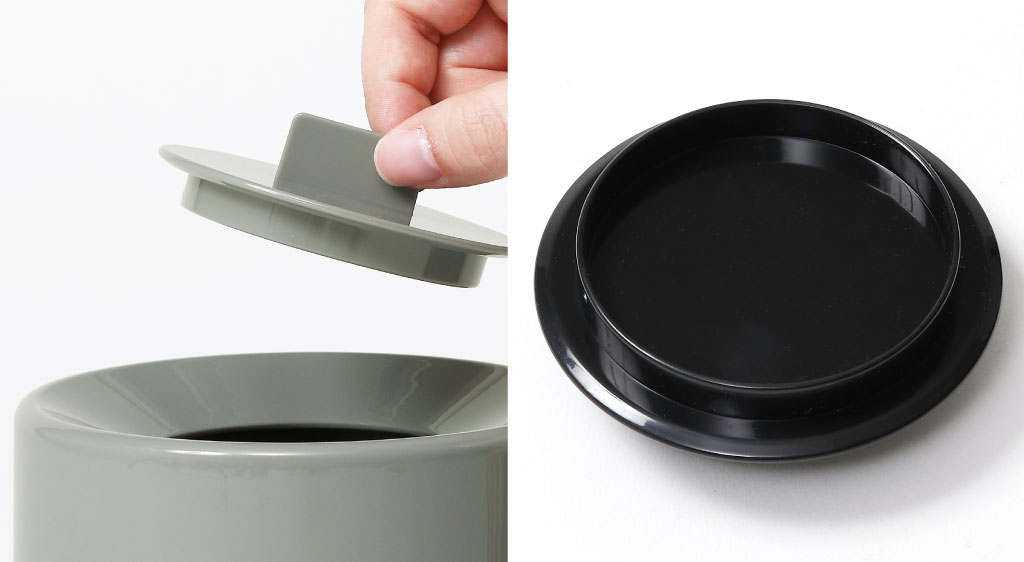 つまみやすい持ち手付きで、開口部にぴったりはまり、ロック式でないのでごみを捨てたいときはスムーズに開け閉めが可能です。