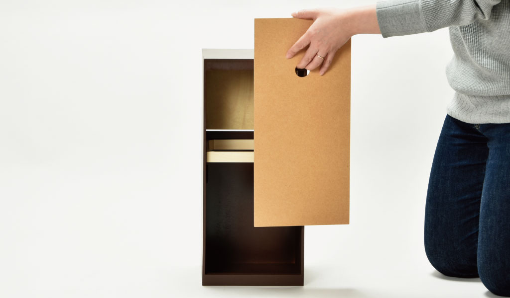 上部にフタがないので、天板にちょっとした小物など置くこともできます。ソファーの横に置けばリモコンや本など置くスペースもできて便利です。