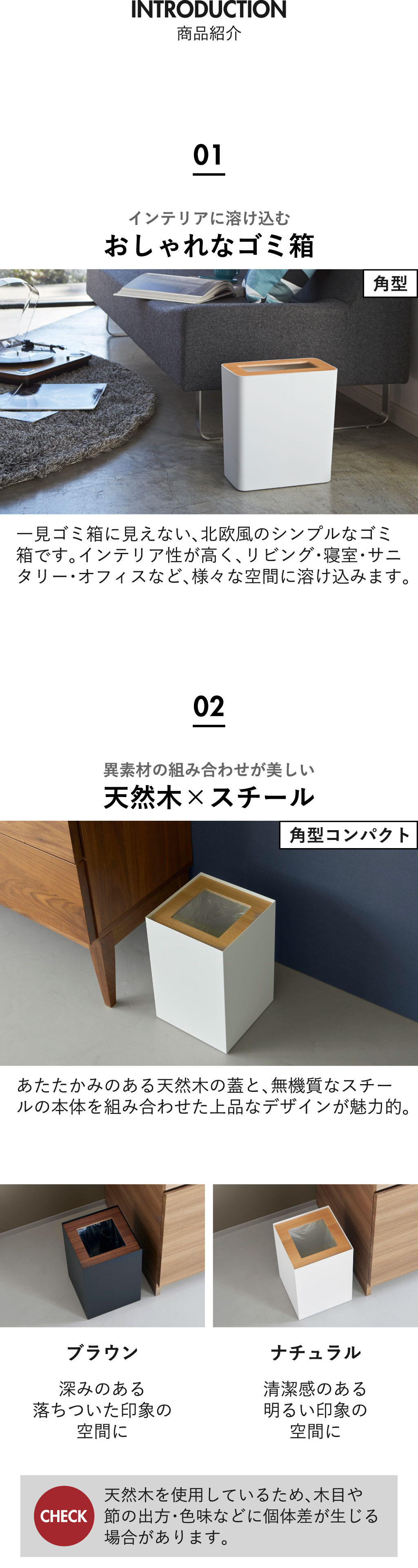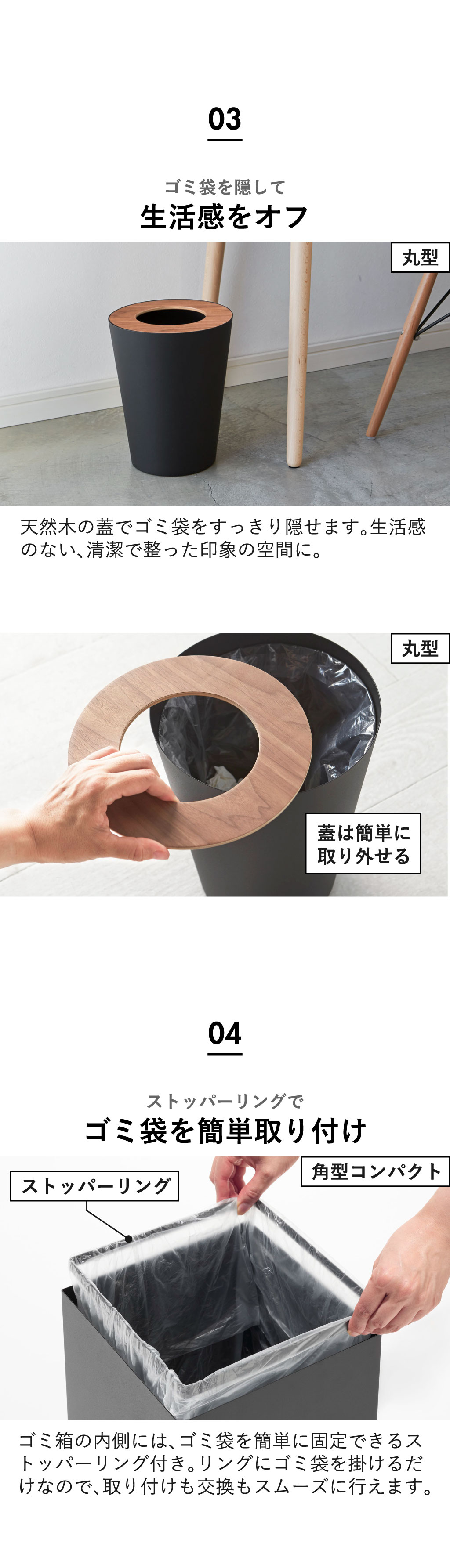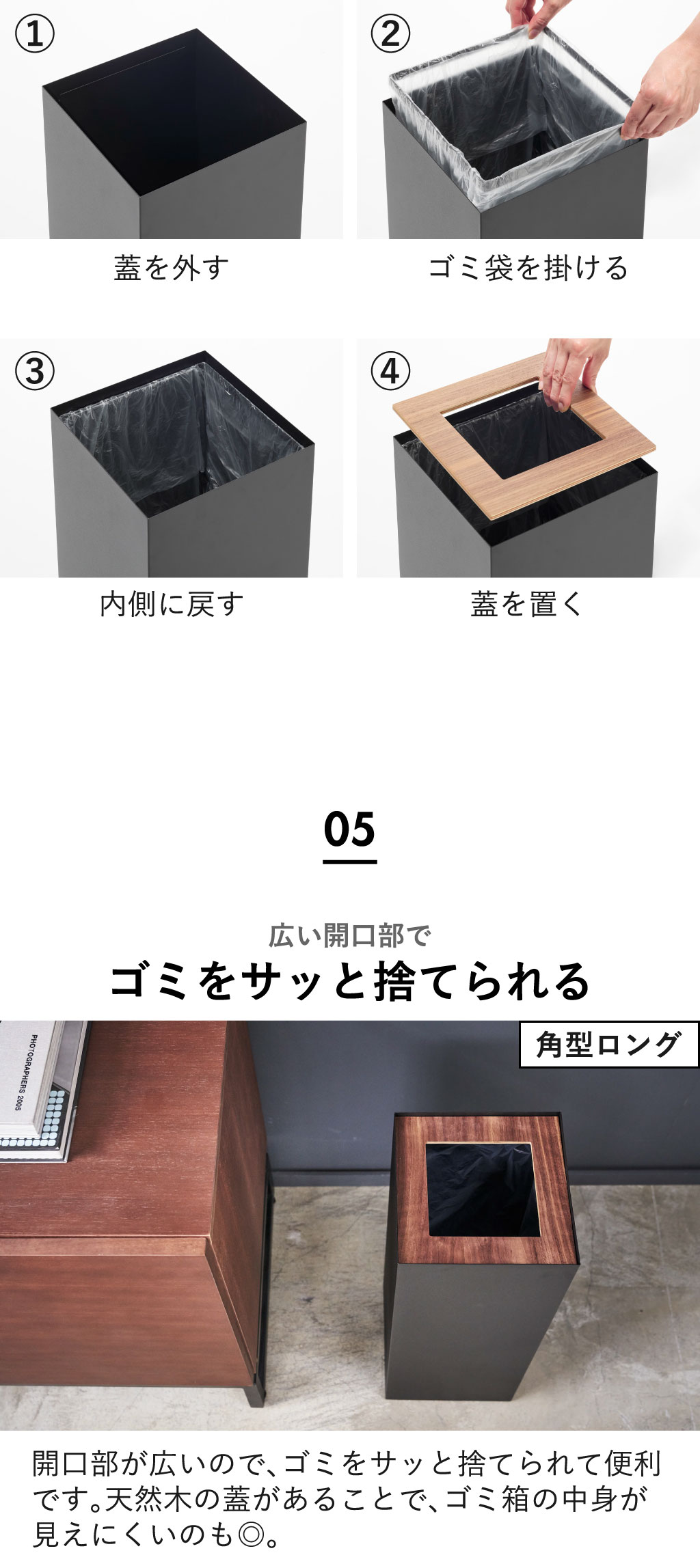 どうしても生活感が出やすいゴミ箱ですが、天然木の蓋でゴミ袋を隠せるため、