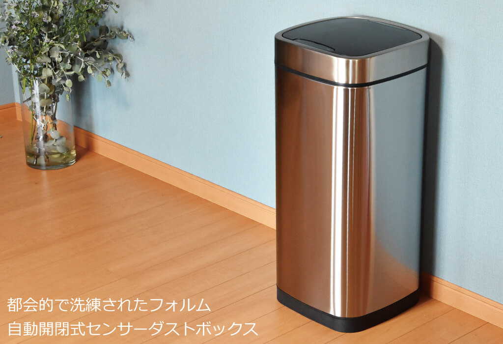 都会的で洗練されたフォルムの自動開閉式ステンレスセンサーゴミ箱です。