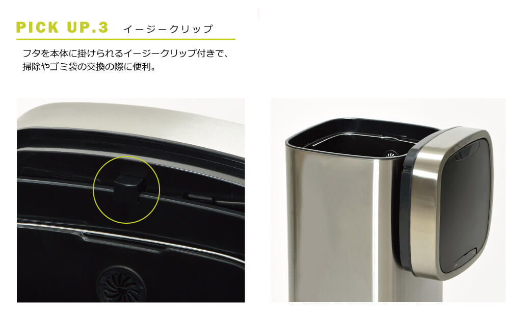 フタを本体に掛けられるイージークリップ付きで掃除やゴミ袋の交換の際に便利。