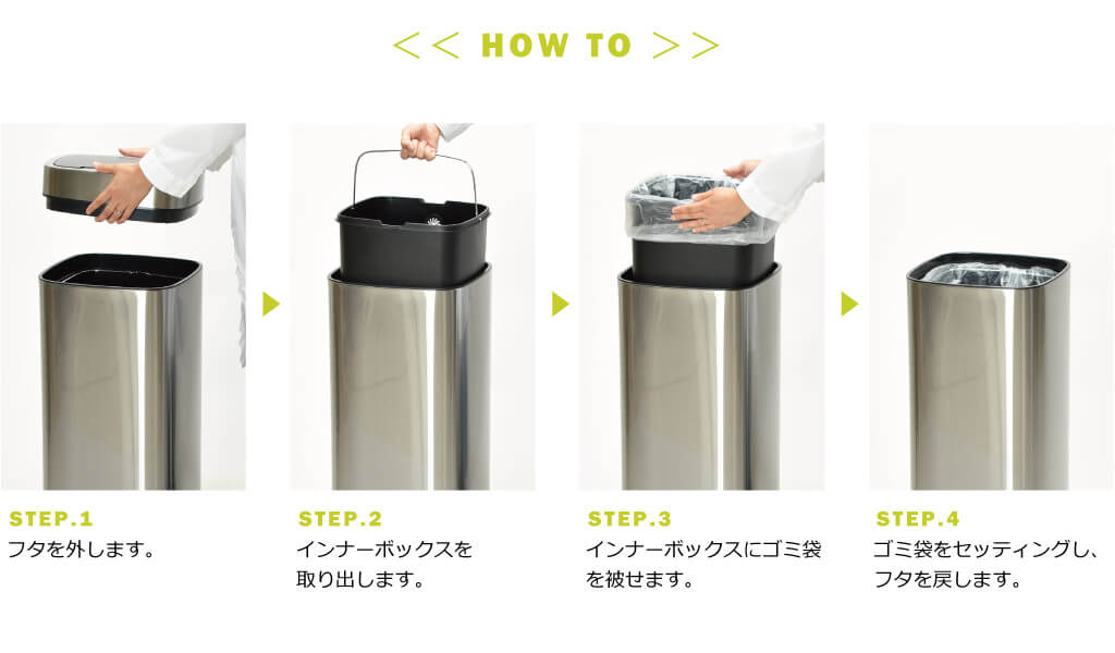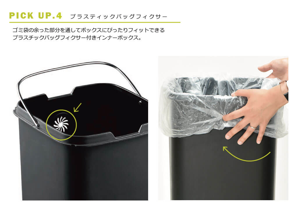 インナーボックスの片面にある穴にゴミ袋を入れ込むことにより、フタからゴミ袋をはみ出すことなくゴミ袋をセッティング。