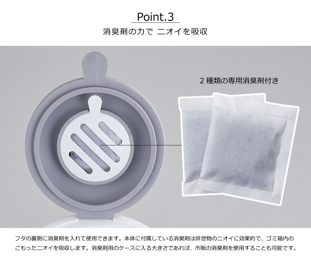 ニオイ対策は2段階。まず、フタと内フタの2重構造になっており、ゴミ箱を隙間なく密閉します。そして、フタの裏側の消臭剤で、ゴミ箱内のこもったニオイを吸収します。