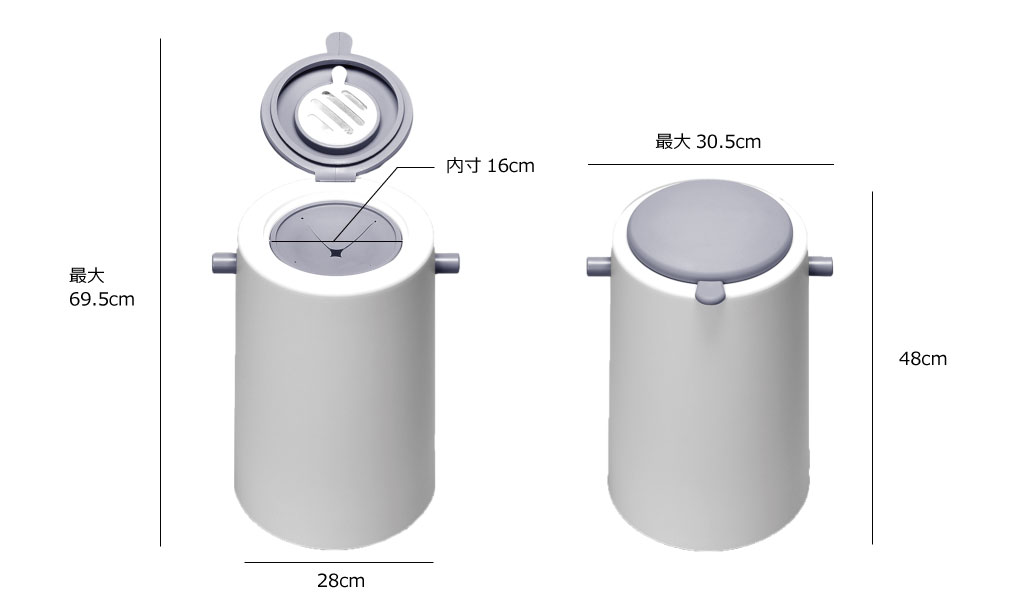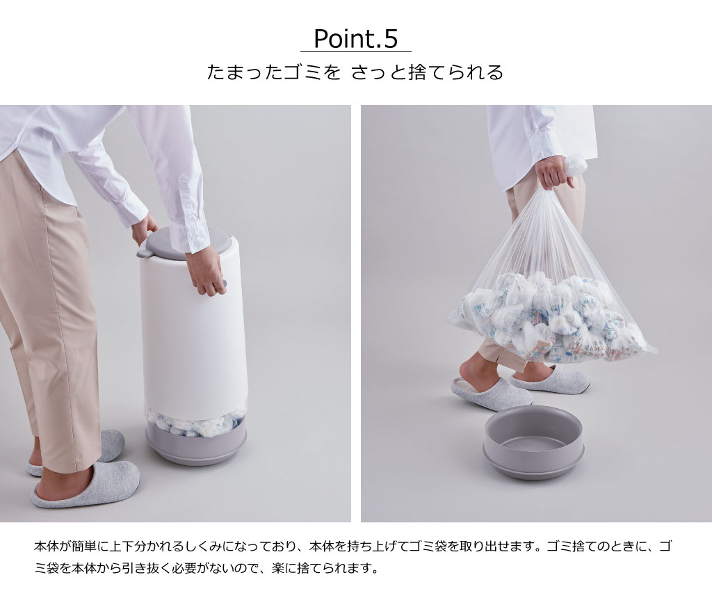容量は20Lで、推奨ゴミ袋は45Lサイズです。新生児用のオムツが30個(およそ5日分)捨てられます。