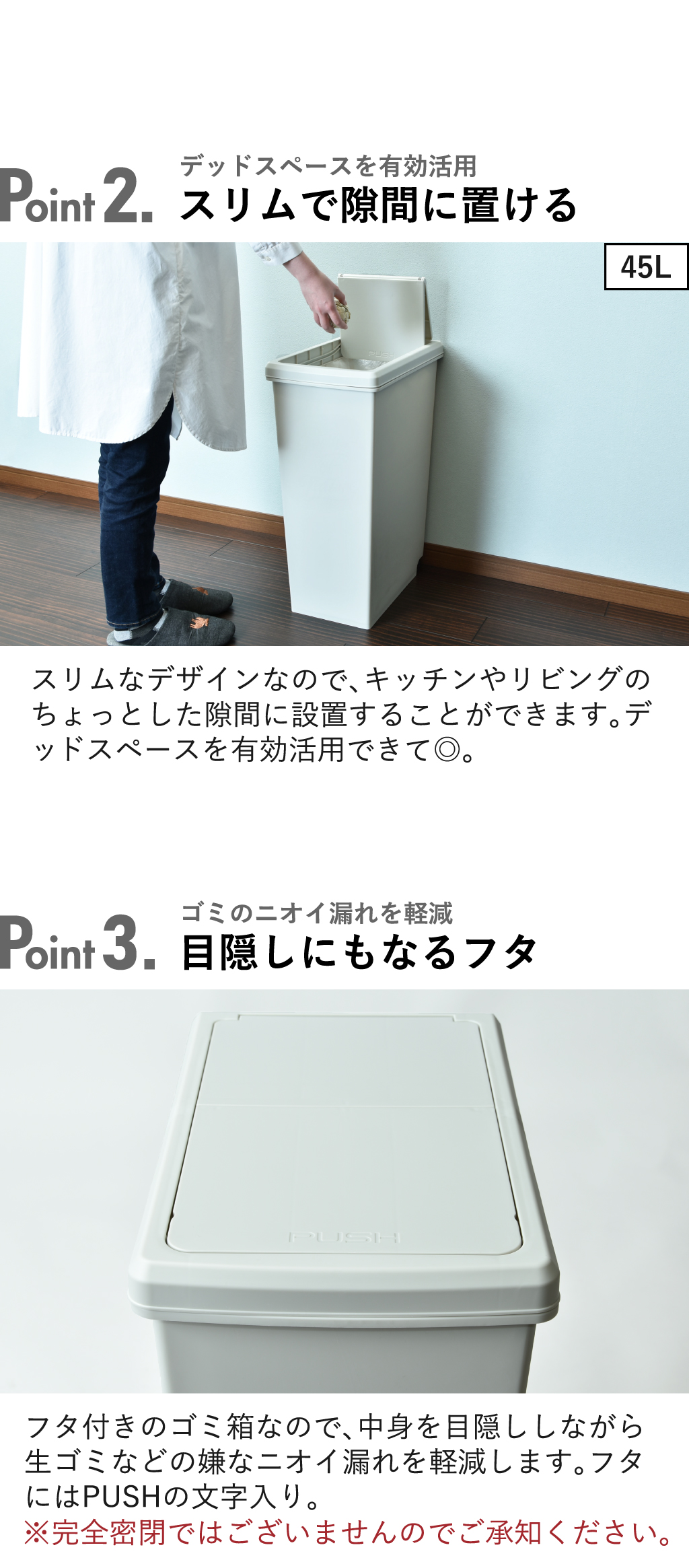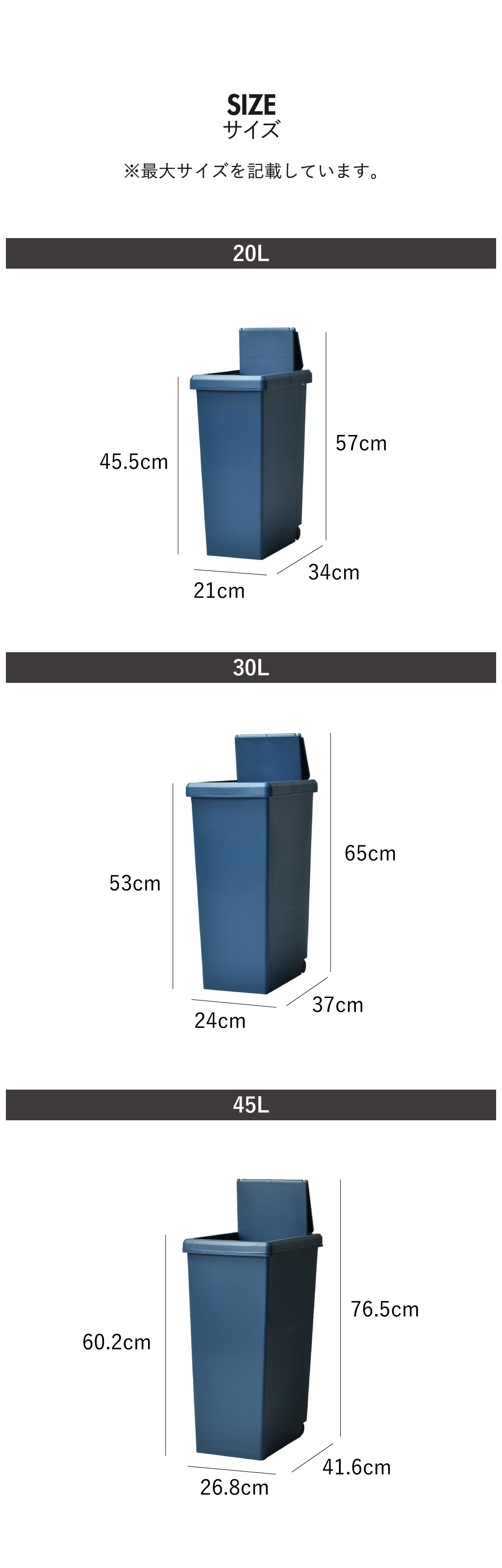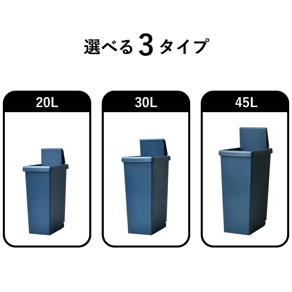 30リットルタイプと45リットルタイプは45リットルゴミ袋に対応しています。