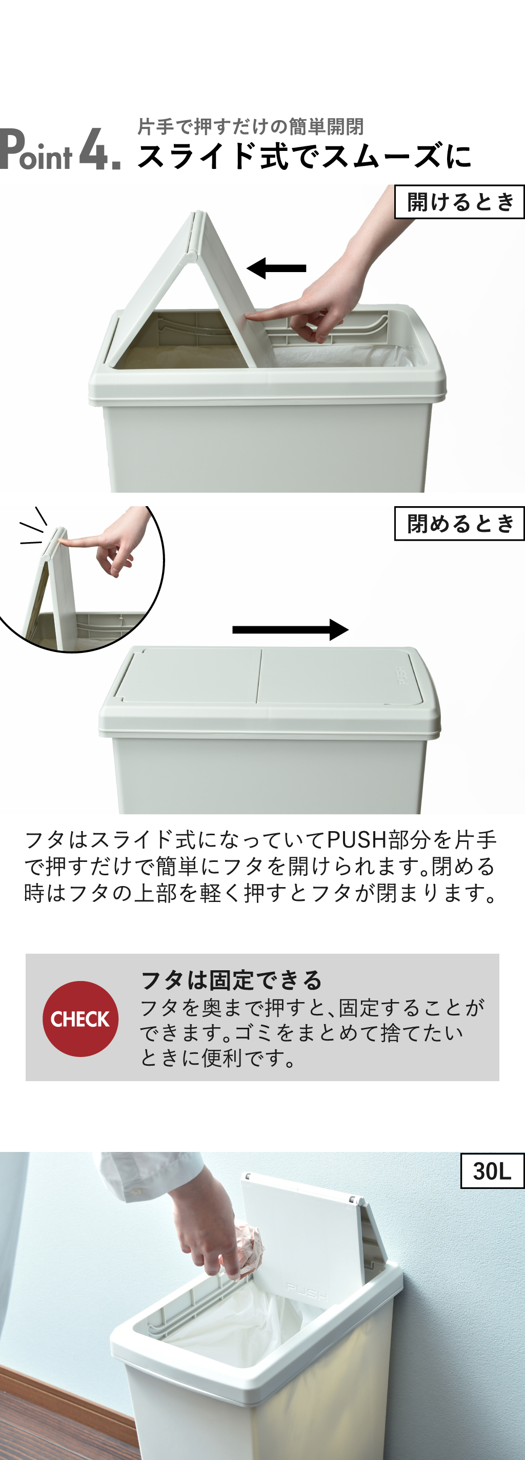 お部屋のおしゃれな雰囲気を損ねないのも◎。ゴミ箱のふたはスライド式でスムーズに開閉できます。