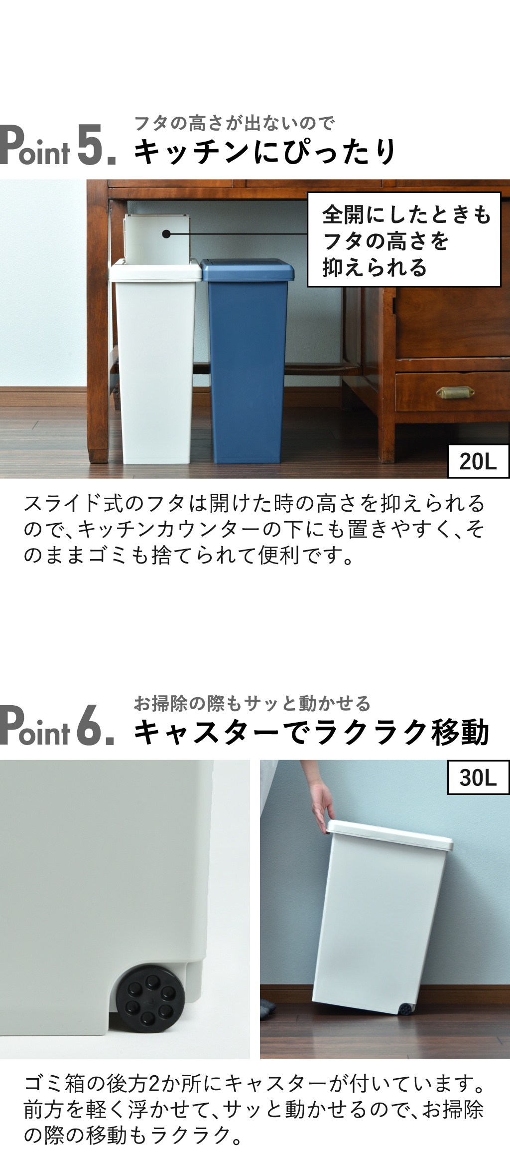スライド式のふたは開けても高さを抑えられるので、キッチンカウンターの下にもすっきり収まります。