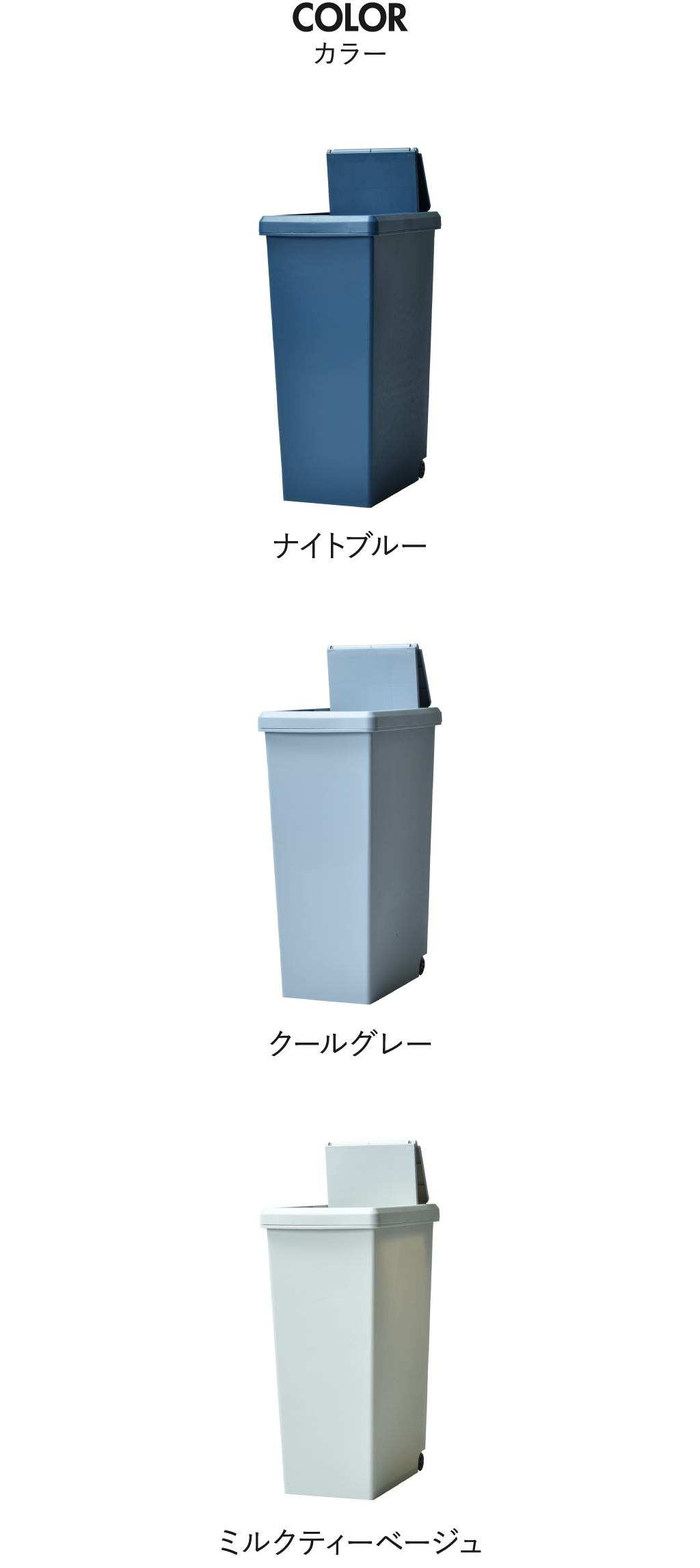 ゴミ箱の色は、ナイトブルー、クールグレー、ミルクティーべージュのおしゃれな3色からお選びいただけます。