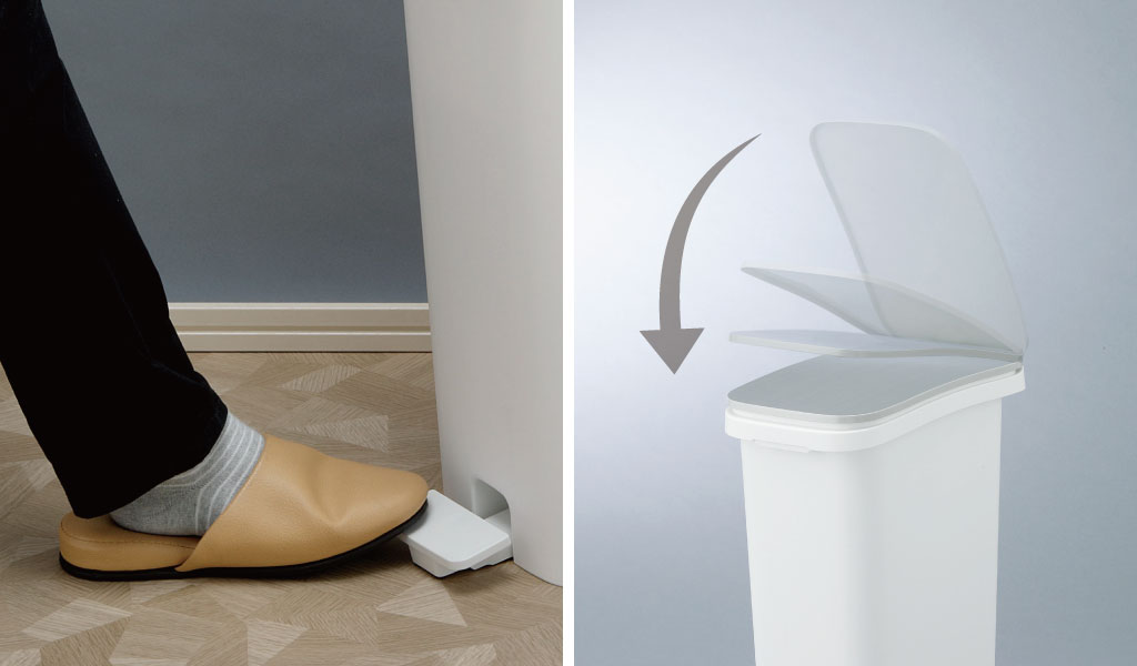 フタの開閉は、料理などで手がふさがっているときでも開けやすいペダル式です。ペダルから足を放すと、ダンパーの働きでゆっくりとフタが閉じます。耳障りな音が鳴らず、ストレスフリーに使っていただけます。