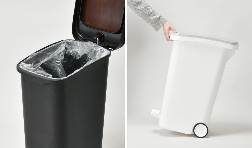 ゴミ袋が中で安定するよう、また、外にゴミ袋がはみ出さないよう中枠が付いています(45Lゴミ袋対応)。底には2輪のキャスター、フタに持ち手が付いており、掃除やゴミ袋交換の際の移動も楽々です。