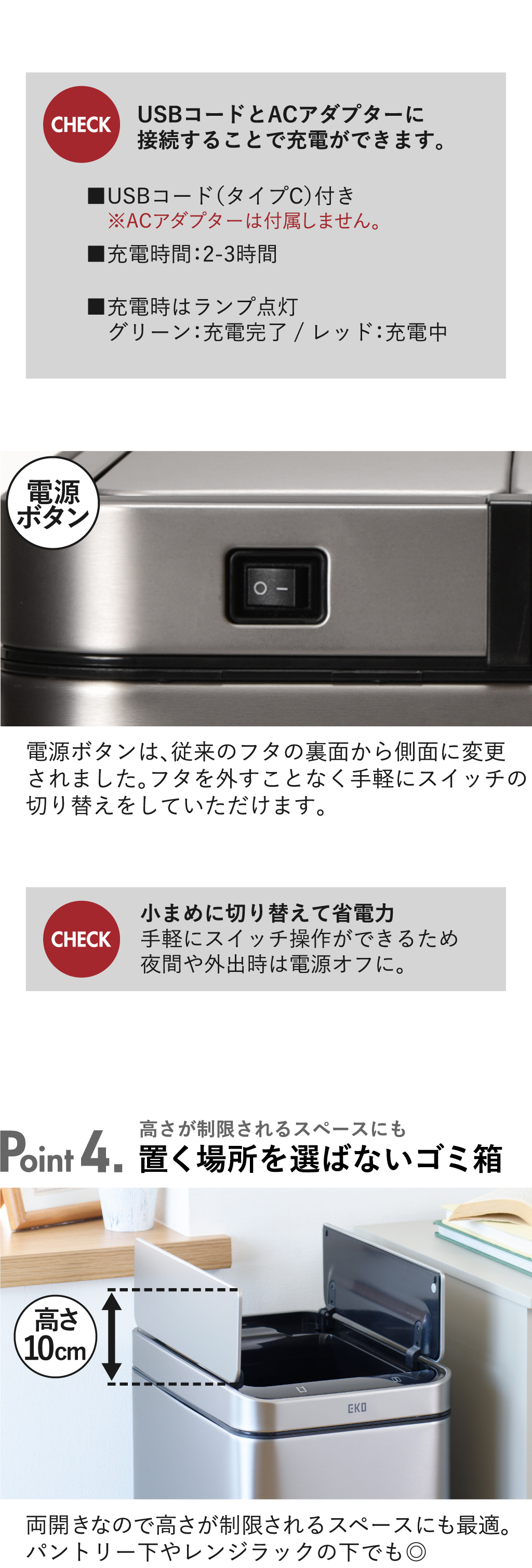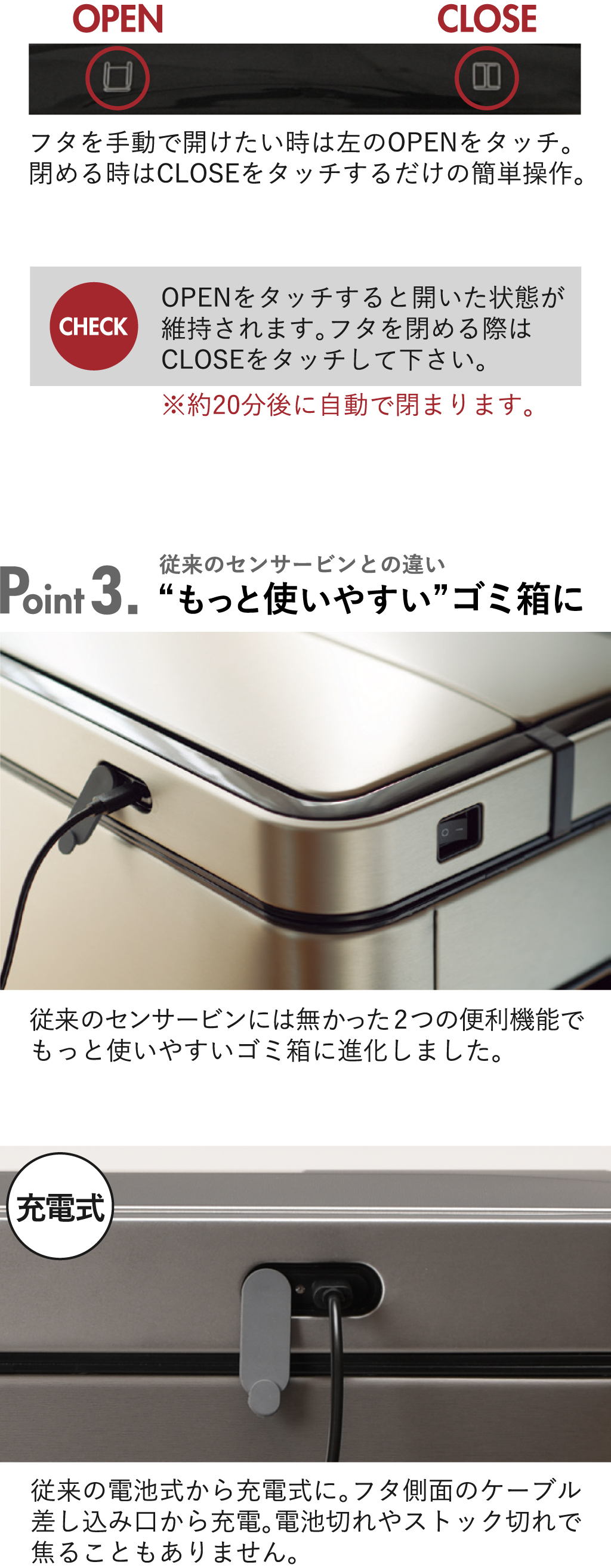 従来のゴミ箱では電池を使用していましたが、充電式に変更になりました。