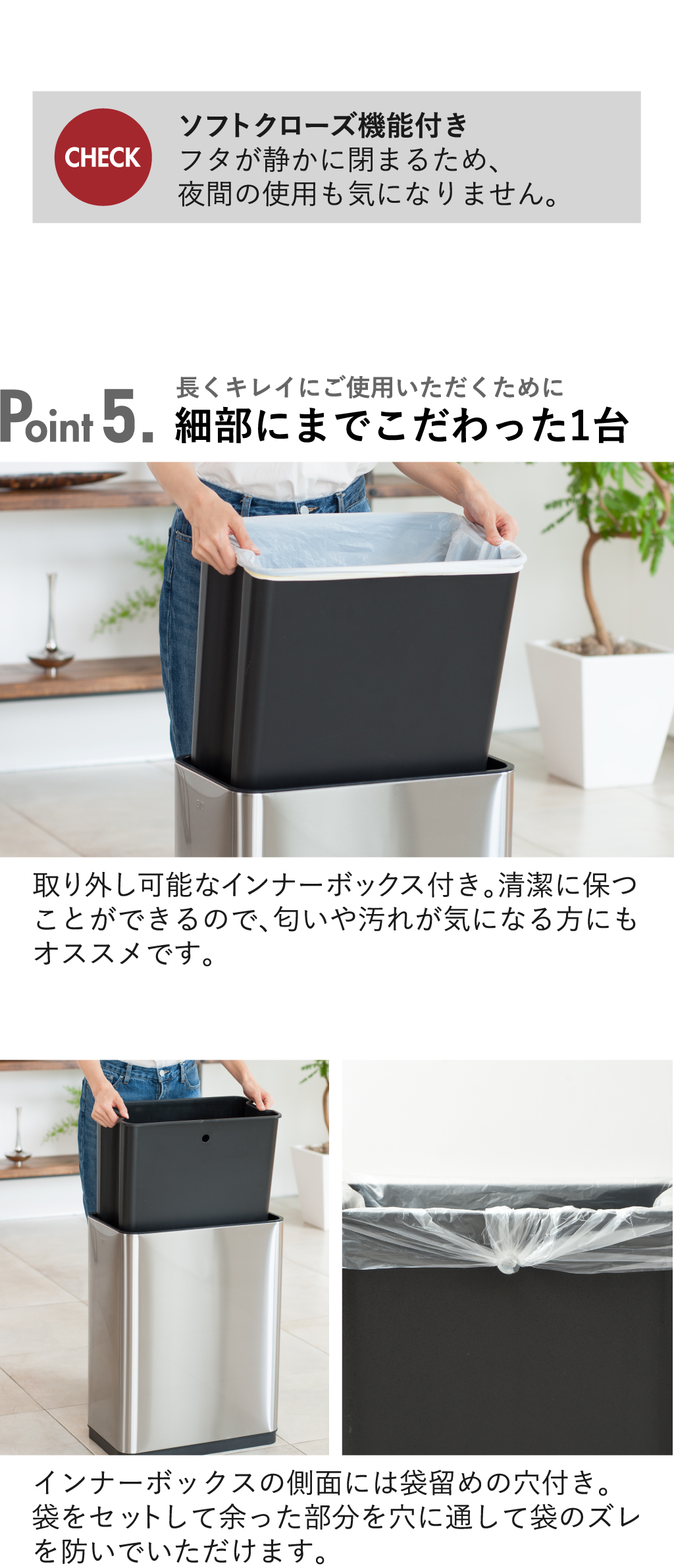 インナーボックス付きでゴミ袋の取り換えやお手入れもスムーズ。