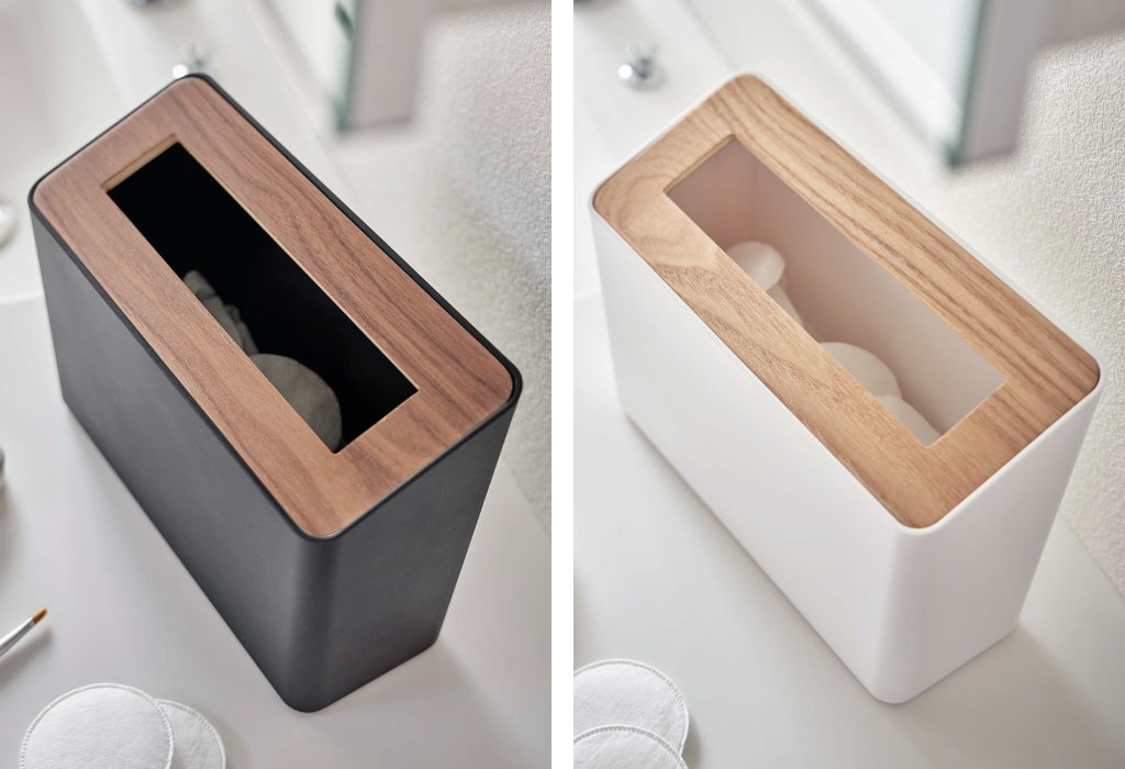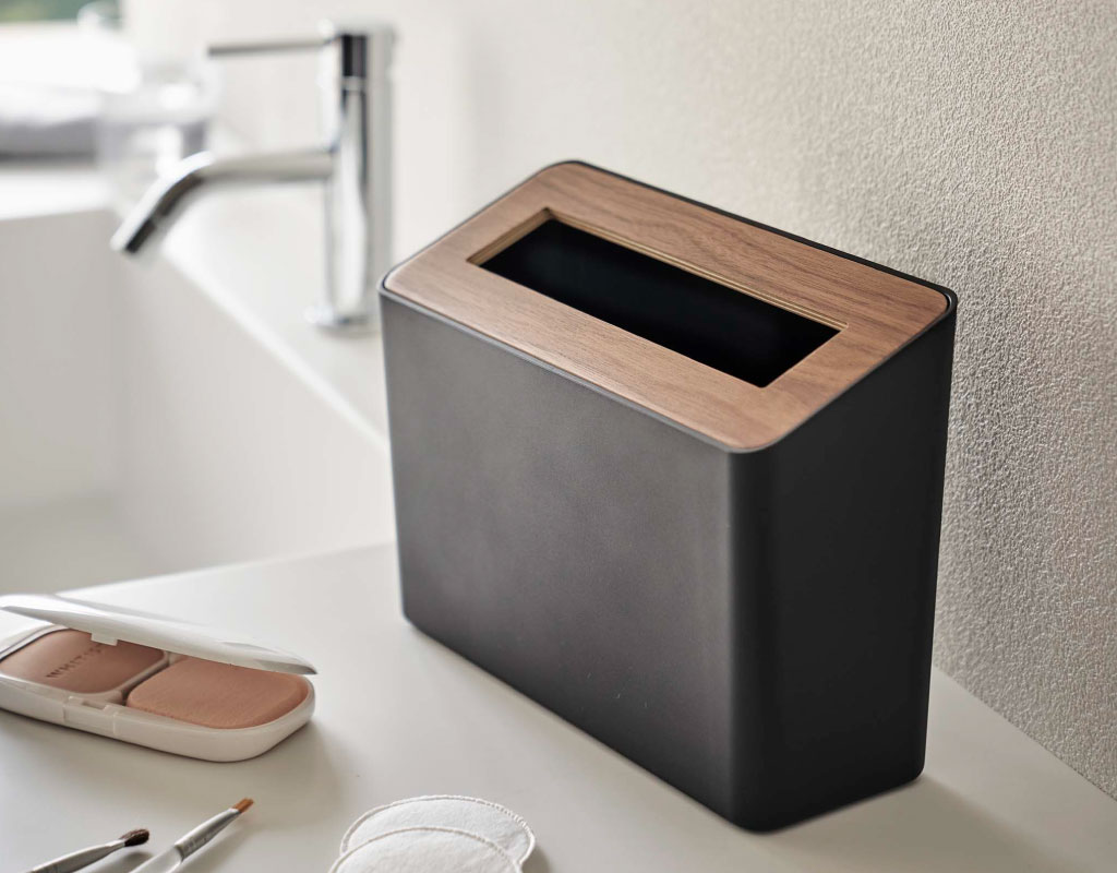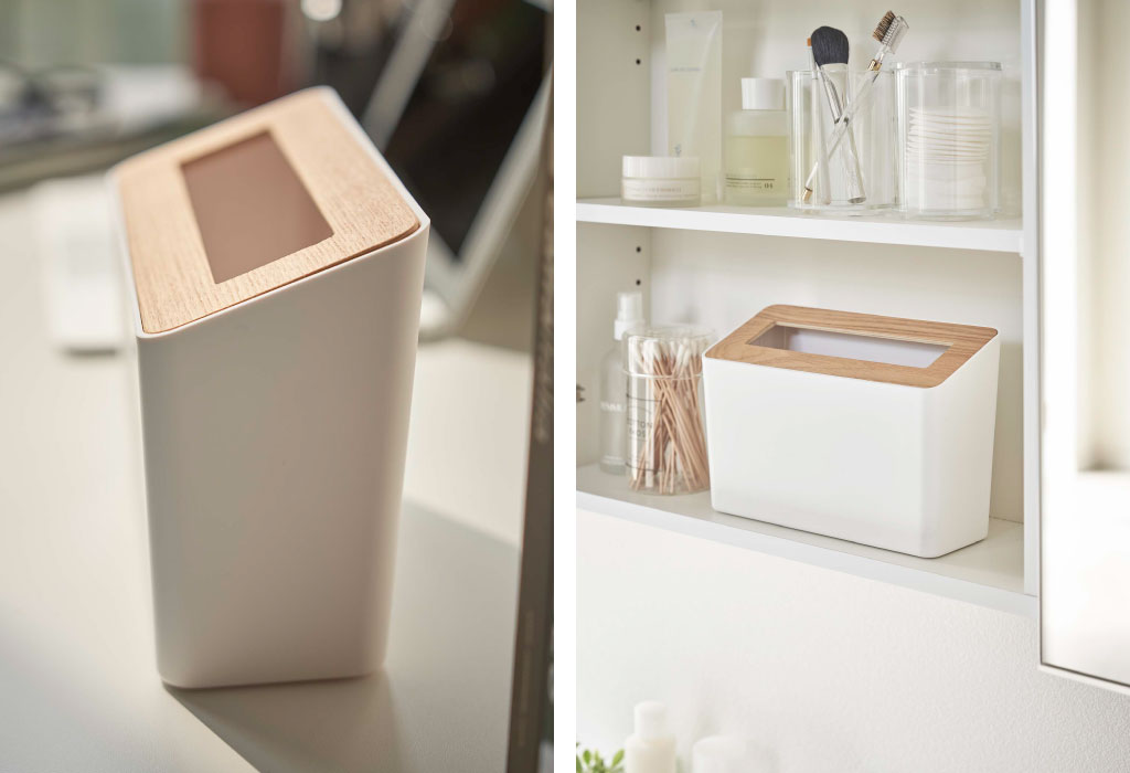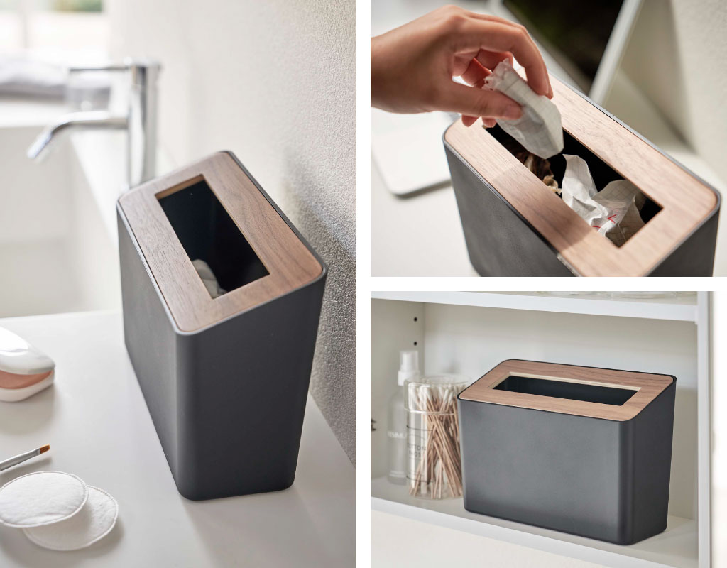 本体は水回りでも安心して使えるプラスチック製。洗面台に置けばメイク時のコットンや綿棒を、キッチンに置けば手を拭いたペーパータオルなどを捨てるのに便利です。また、お手入れも簡単だから、中に袋を入れなくてもそのままお使いいただけます。