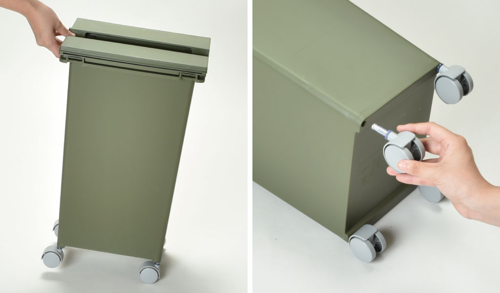 ゴミ箱下には大きなキャスターが4つ付いています。360℃方向に動かすことができるので、移動もラクラクです。キャスターはゴミ箱本体を倒して底面4コーナーにある穴に差し込んで使ってください。