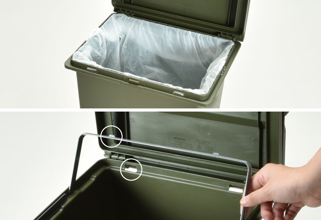 ゴミ袋のズレや落ちを防止する「袋止め」が付いています。着脱が簡単な2ケ所分離型なので、取り付けもスムーズで簡単です。ズレ防止突起がついているので、袋をしっかりと固定でき、安心です。