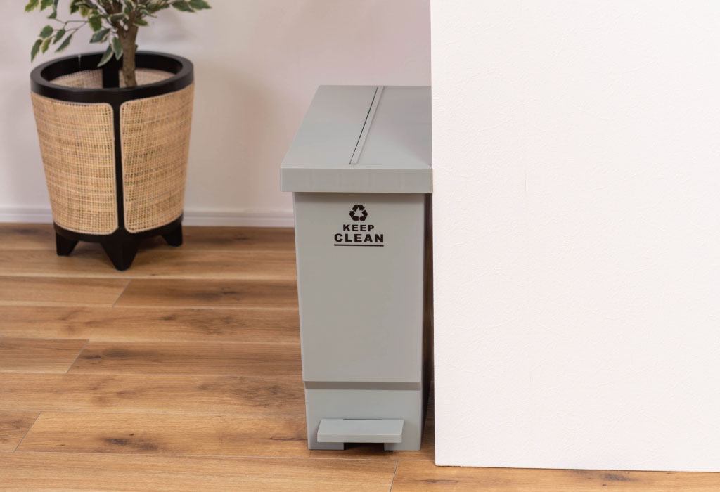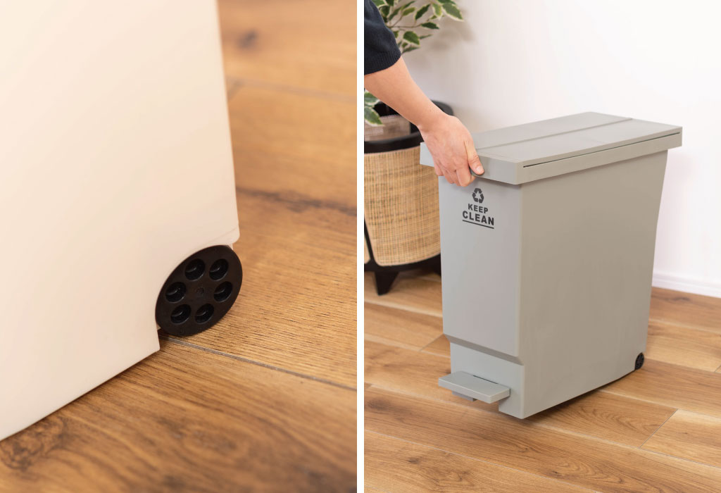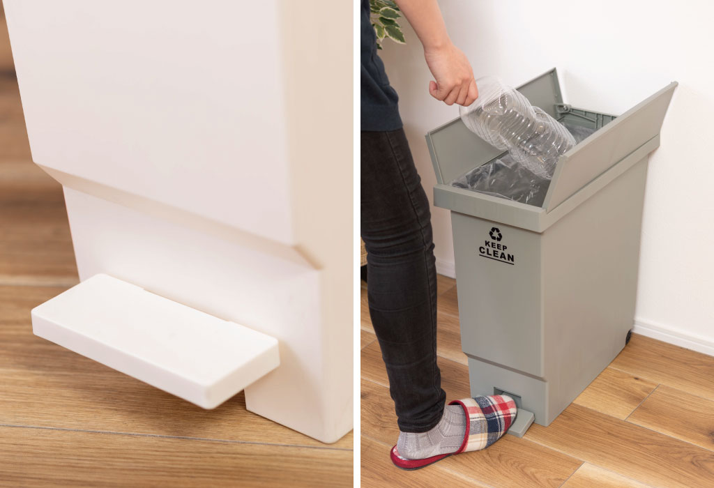 ゴミ箱の横幅は約22.8cmと、とってもスリム。カウンター下に並べて置いたり、家具の隙間にも置きやすいデザインです。置く場所を選ばないので、スペースが限られたキッチンにもぴったりです。ペダルも導線の邪魔をしないように設計されています。