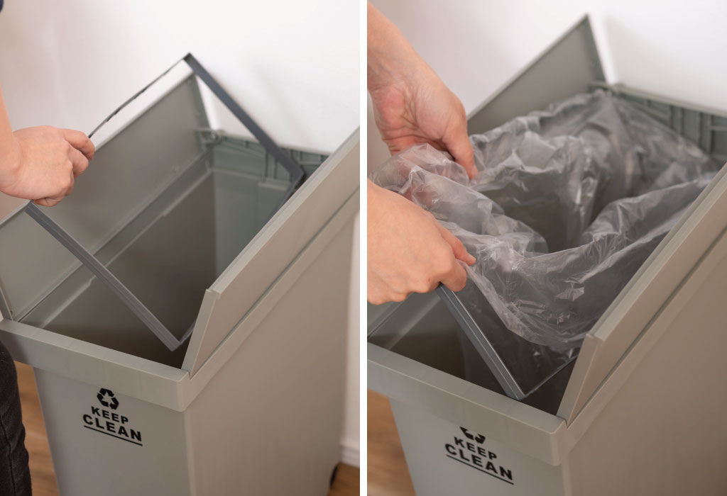 ゴミ袋を固定できる袋留め付き。ゴミ袋がはみ出ず、生活感を抑えてくれます。 内側にある袋留めにゴミ袋を引っ掛けるだけの簡単設置です。