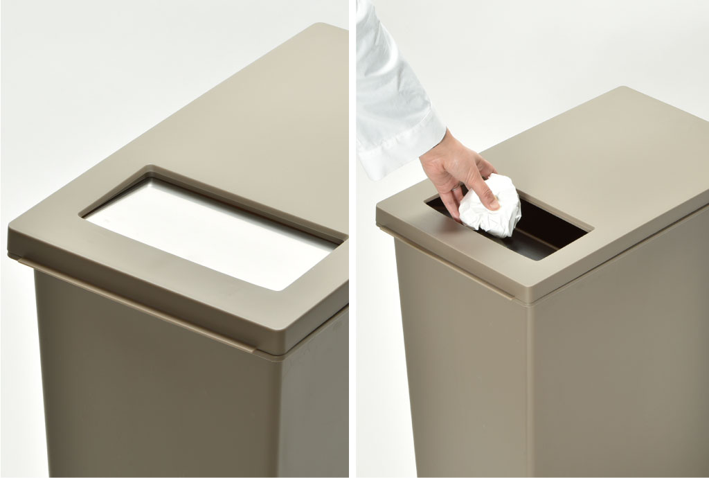 小さめなゴミをサッと捨てたいときは、ステンレスのふたを使って、簡単に捨てることができます。 プッシュふたを使えば、大きくふたが開けられないカウンター下などにも設置することができます。
