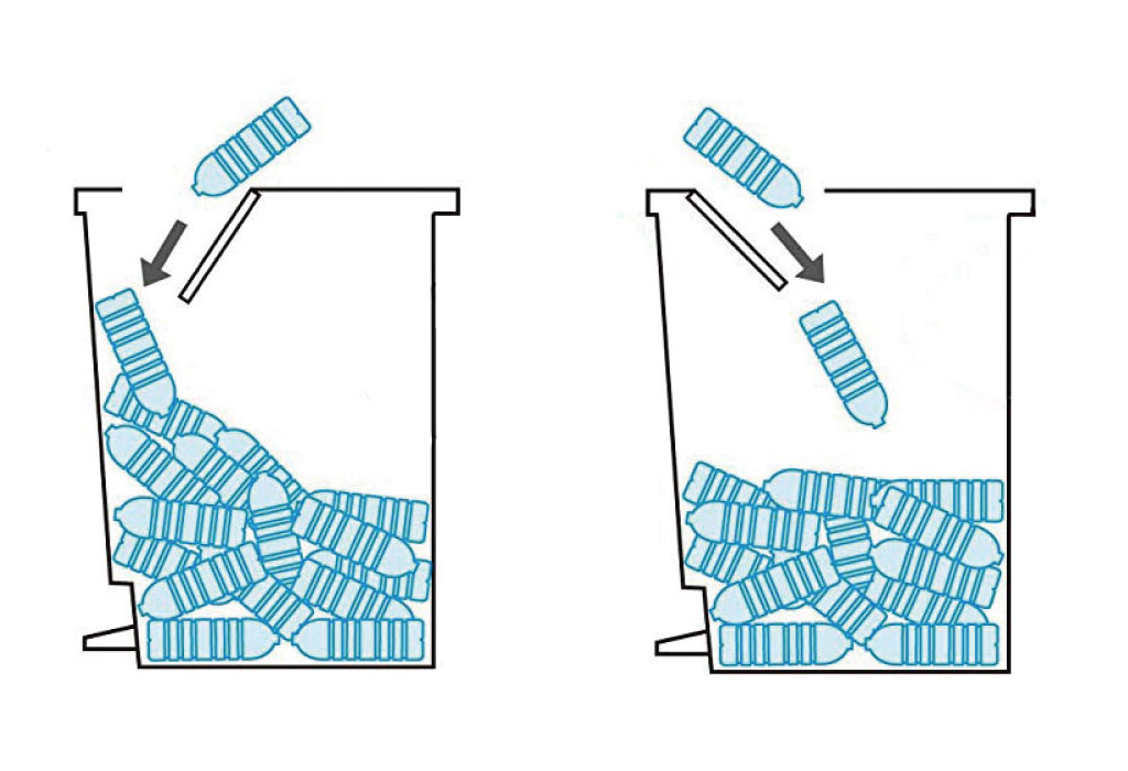 | ゴミを捨てやすく設計されたプッシュふた 従来は、手前にゴミが落ちるよう設計されたいましたが、「ユニード プッシュ&ペダルペール」は、奥にゴミが落ちるように設計されているので、ゴミが平らにたくさん入り、ゴミ箱の容量を最大限生かすことができます。 |