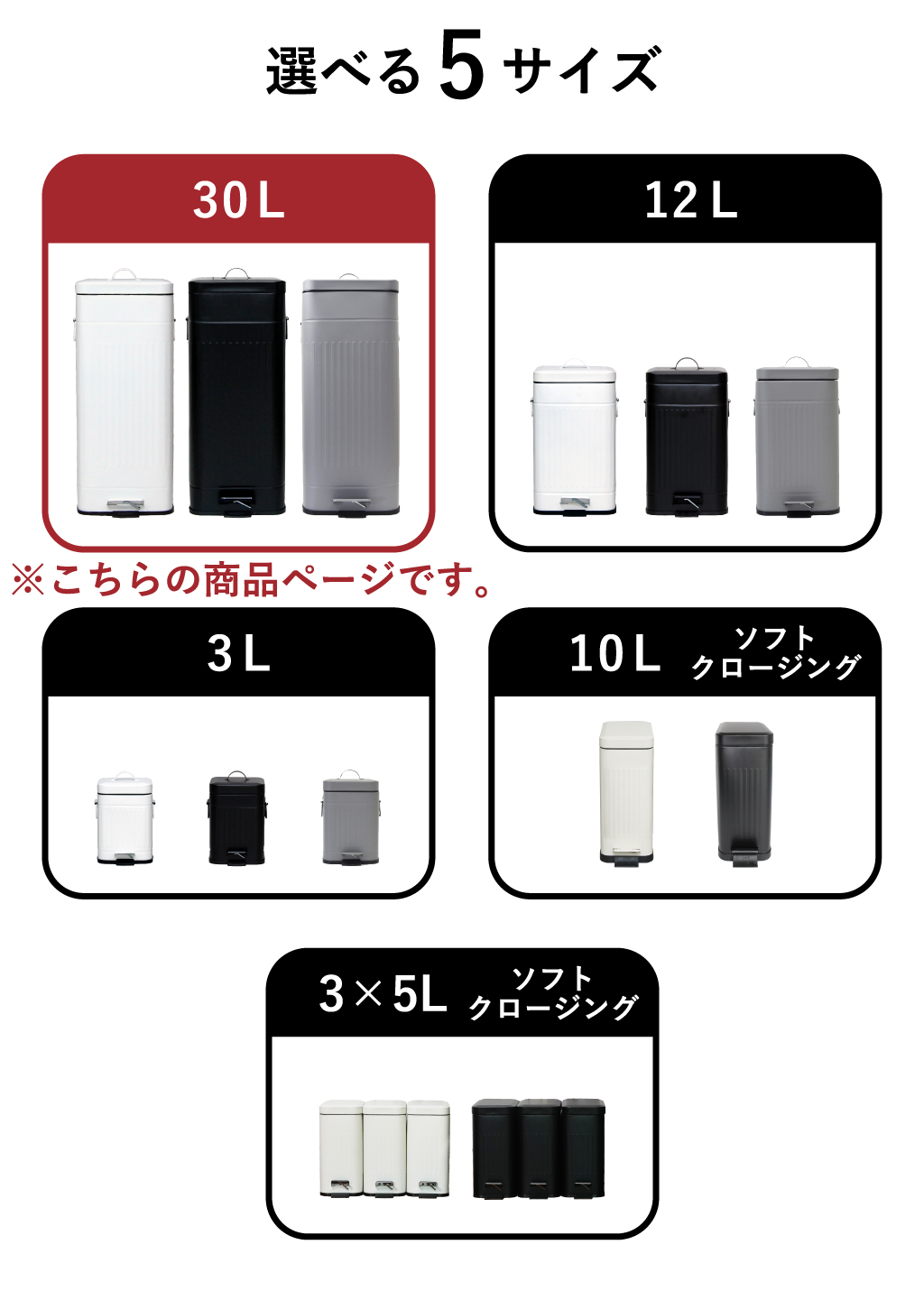 小さい蓋付きゴミ箱から大容量のゴミ箱まで、全5サイズをご用意しました。