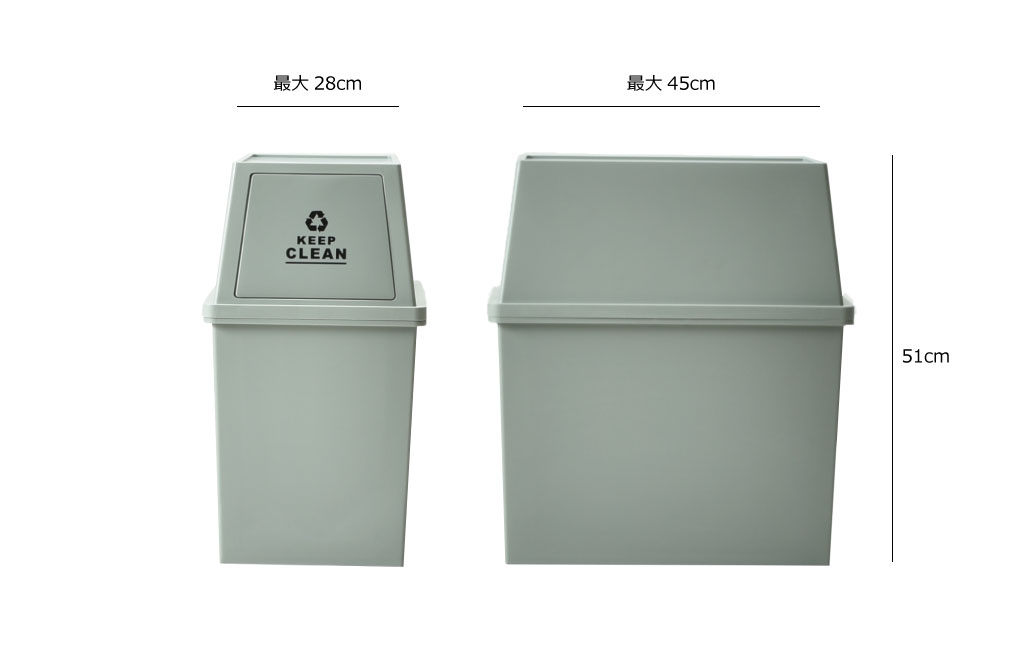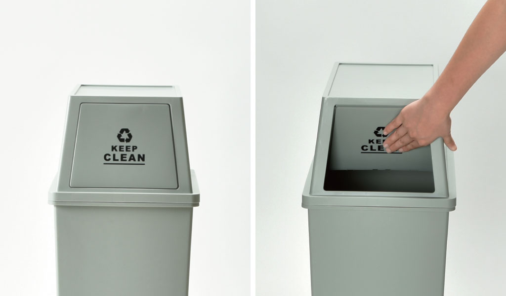 フタ部分を軽く押したら開く「フラップ」仕様になっているので、カウンター下や棚下など、上開きタイプのゴミ箱と違い、空いたスペースを無駄なく有効に使うことができます。