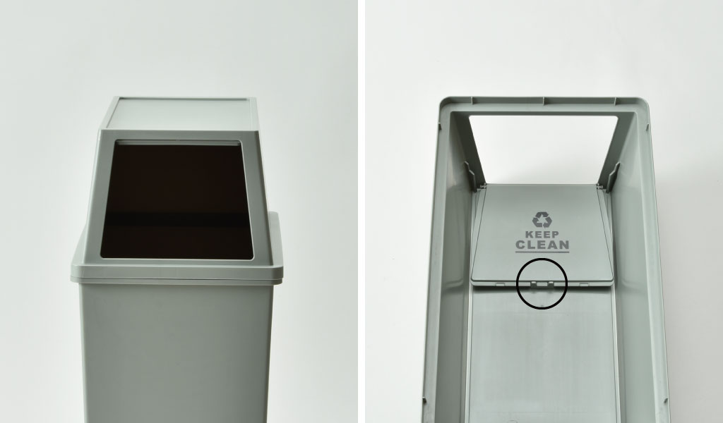 上フタの内側には「フラップロック」が付いているので、開けっ放しでゴミを捨てたい時も大丈夫。フタをプッシュし、「カチッ」と音がするまでフタを上に押し上げればそのままロックされる仕組みになっています。