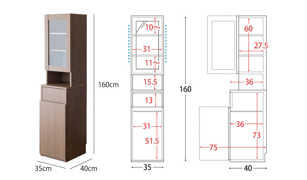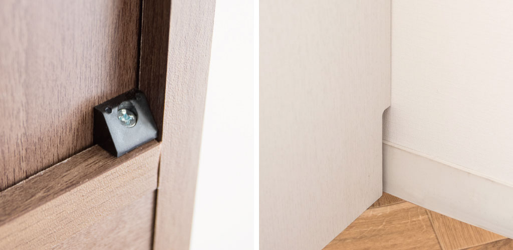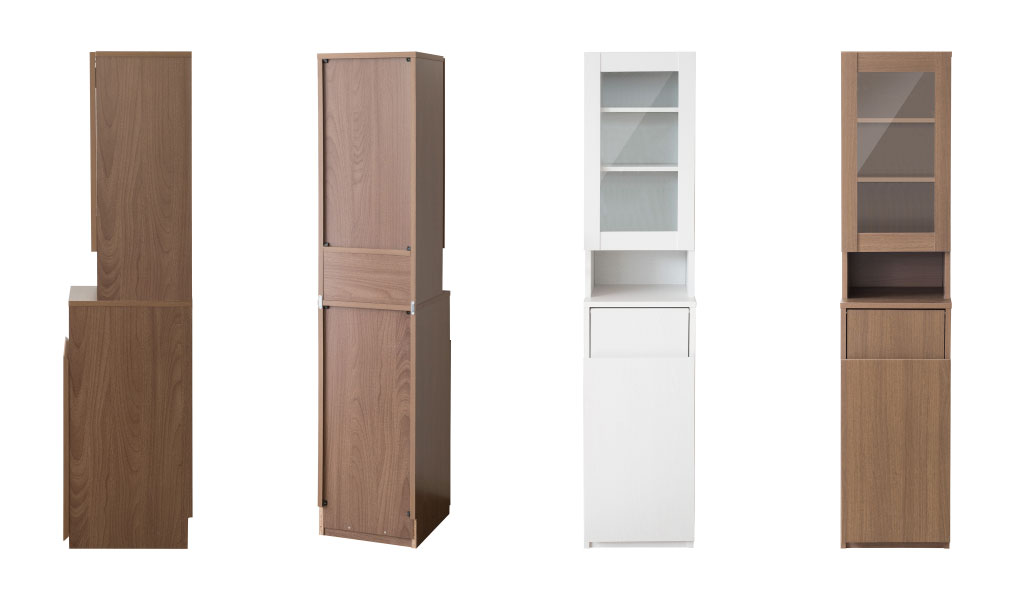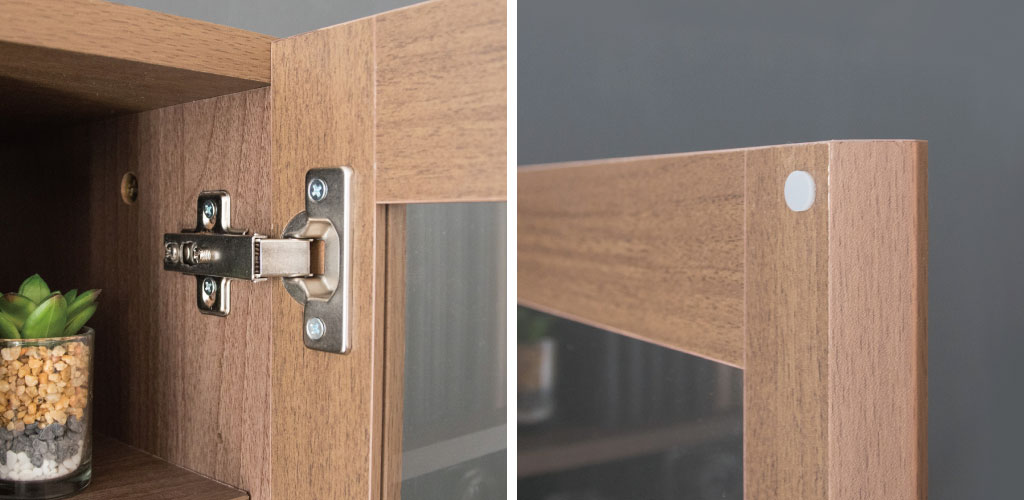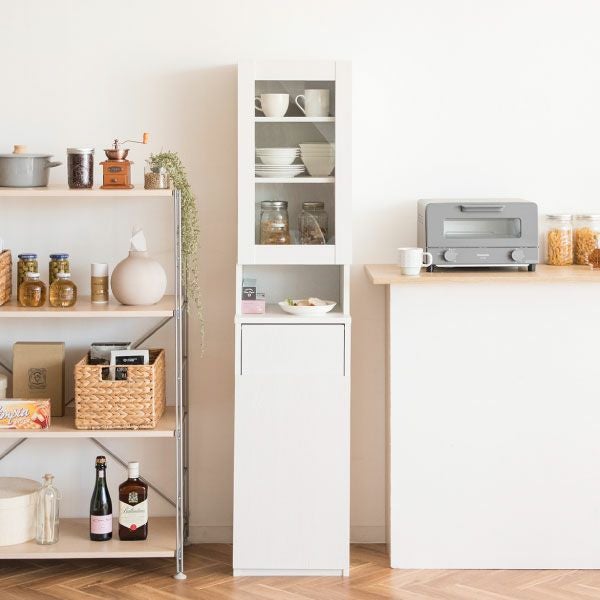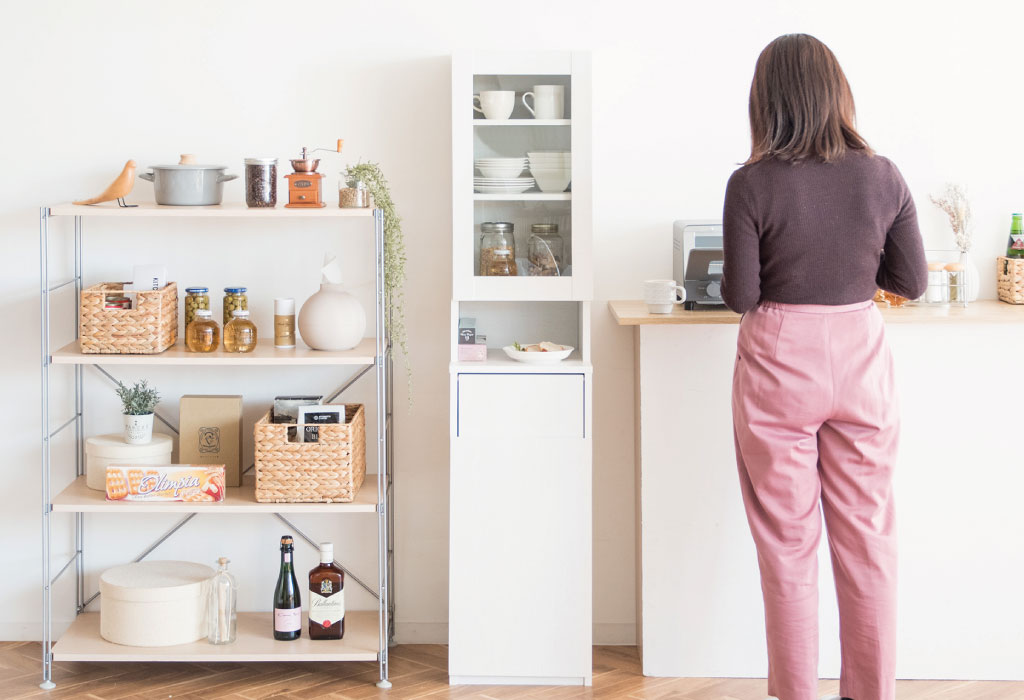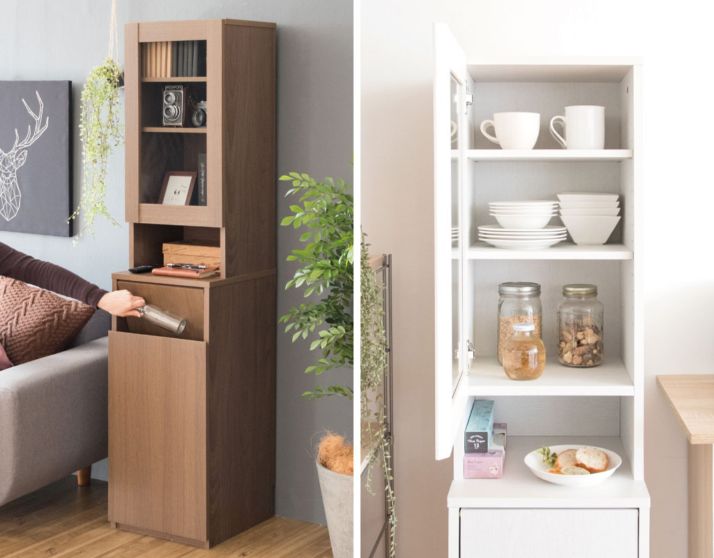 サッと開いて取り出しやすい前扉は、収納したものがよく見えるガラス扉になっています。ホコリの侵入を防ぎながら、お気に入りの食器や食品、雑貨などをディスプレイしながら収納できます。お部屋のレイアウトに合わせて、扉は左右どちらでも取り付け可能です。