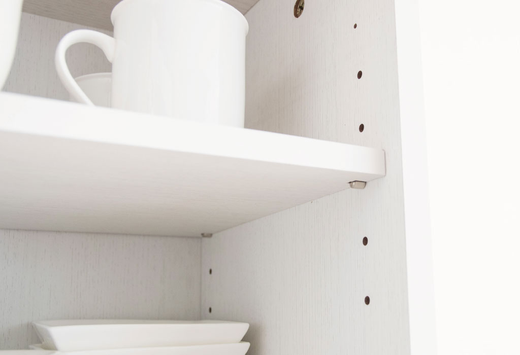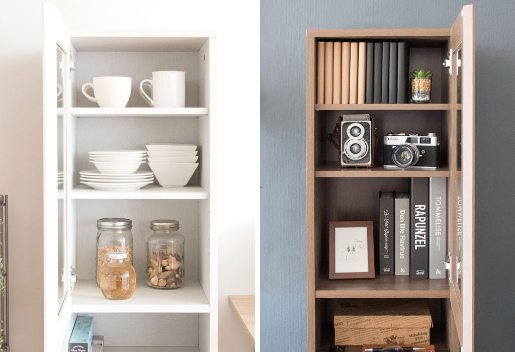 上部の収納はキッチンでは食器棚として、リビングでは飾り棚として活用できます。