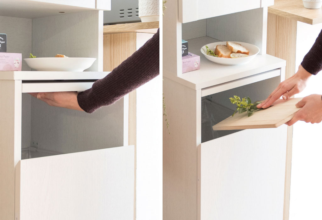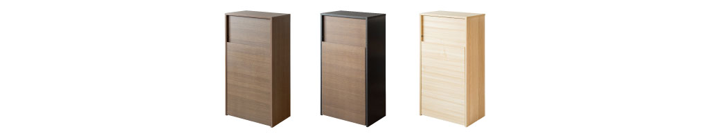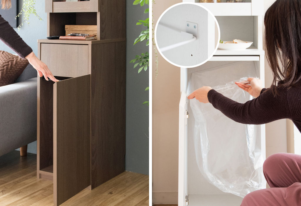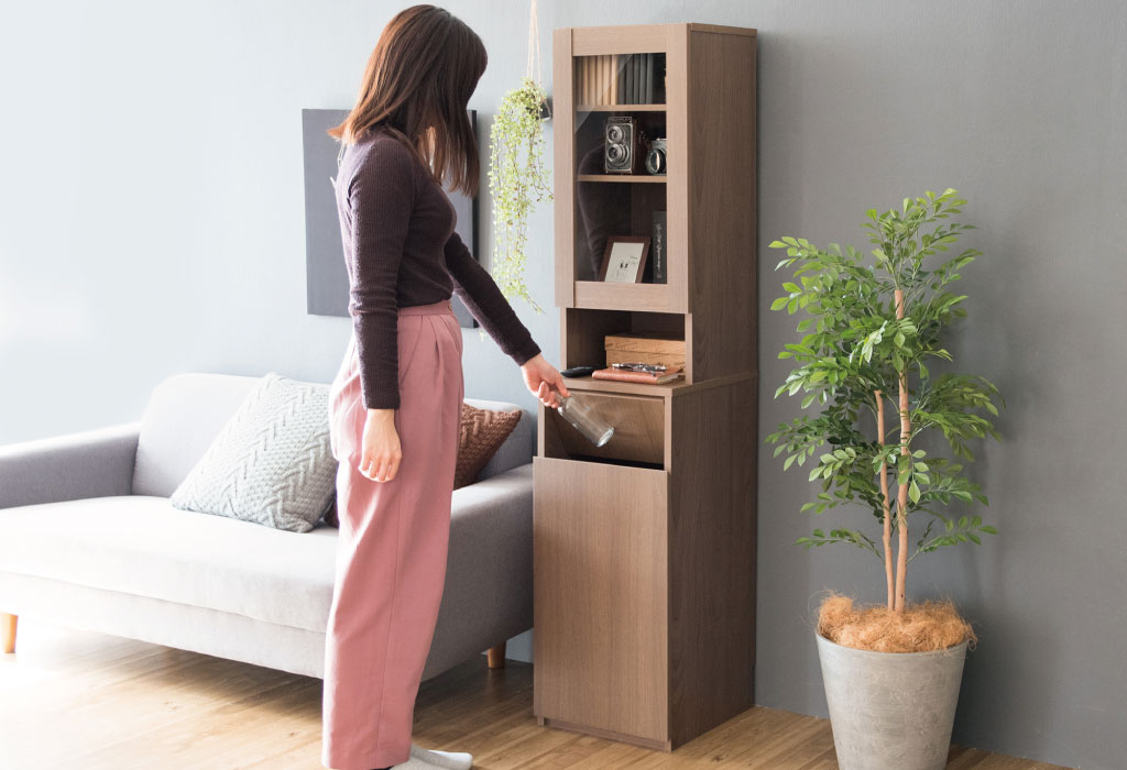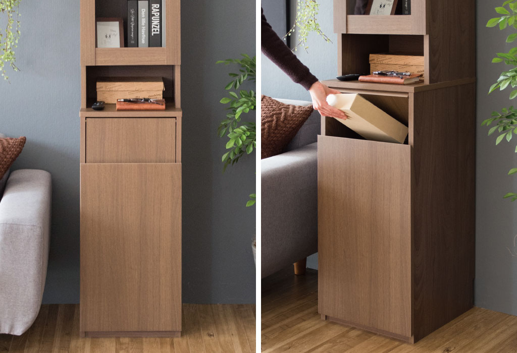 ゴミ箱と収納が1つになったスリムなデザインで、省スペースに設置できます。