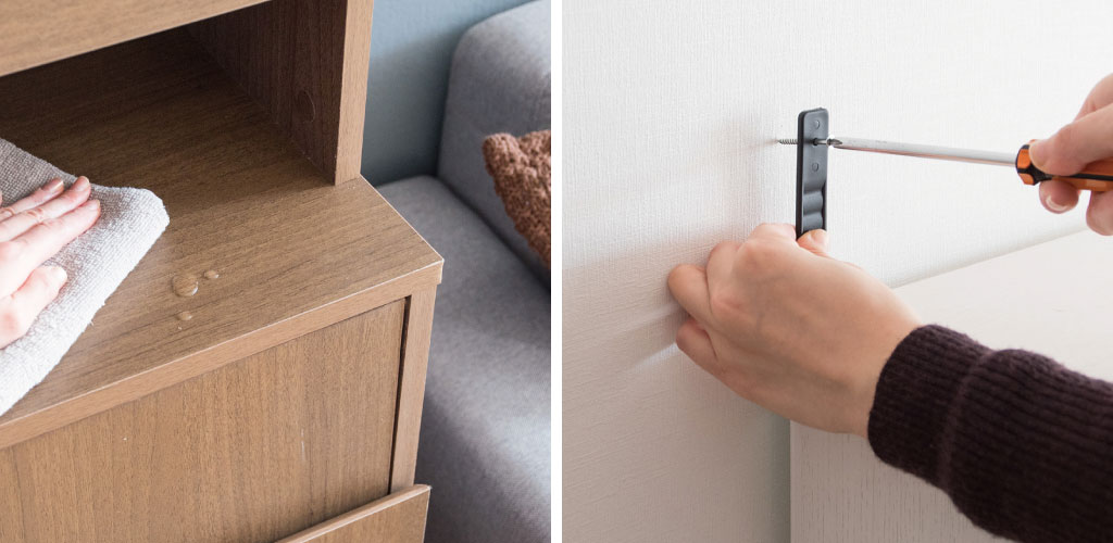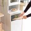 中央の天板は小物のちょい置きに使えて便利。キッチンでは食器を一時的に置いたり、ラップや保存袋を置くのにぴったり。リビングではリモコンやマグカップ置きなど、様々な用途にお使いいただけます。