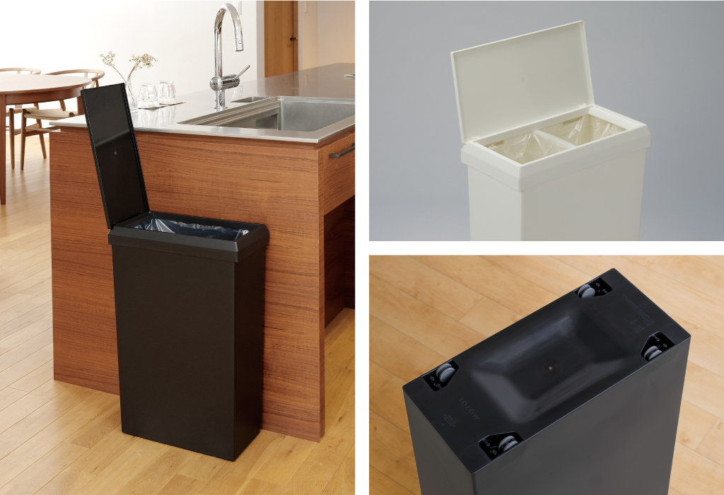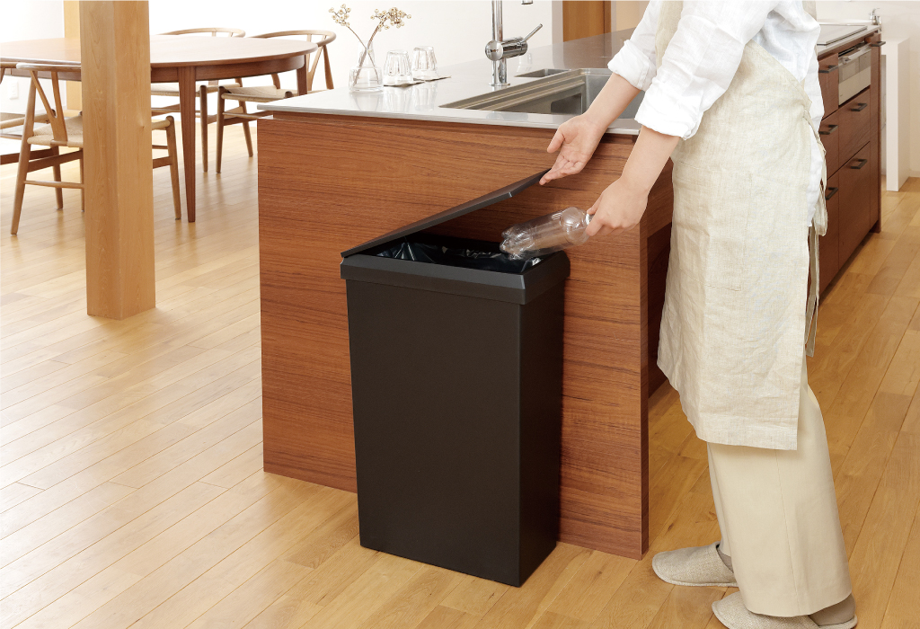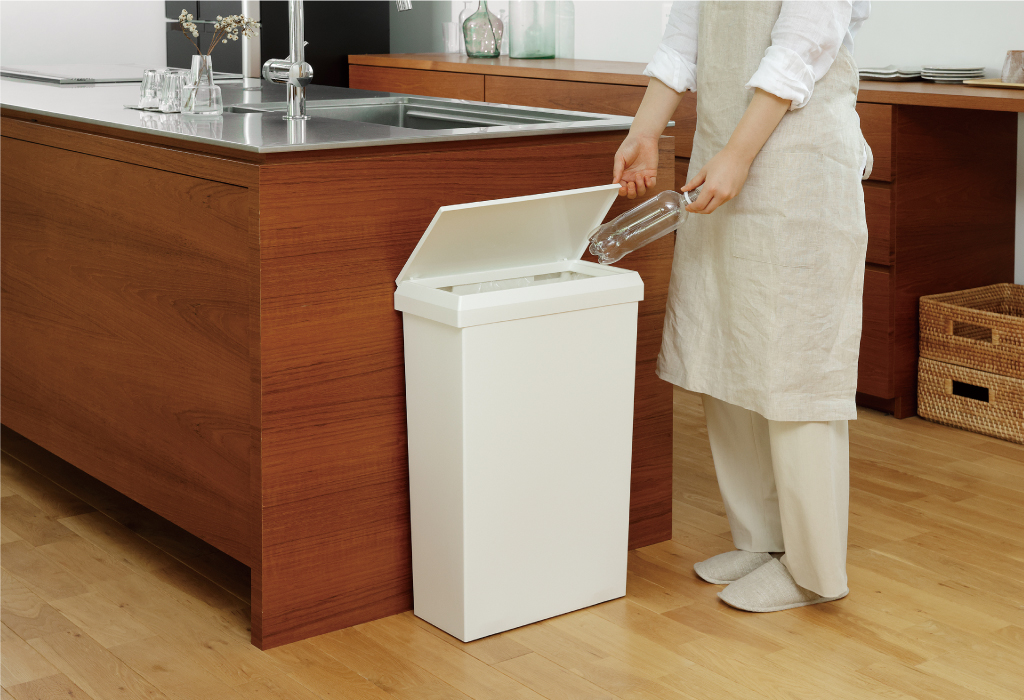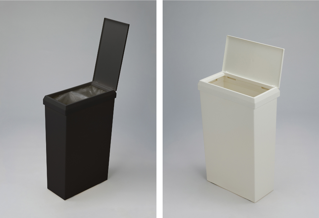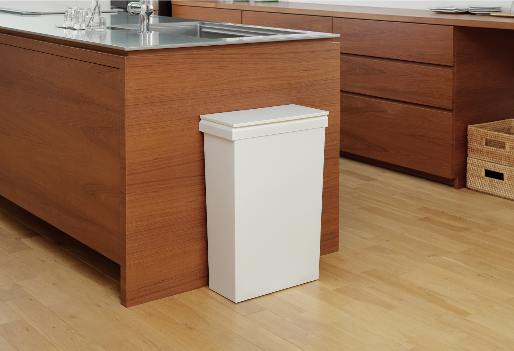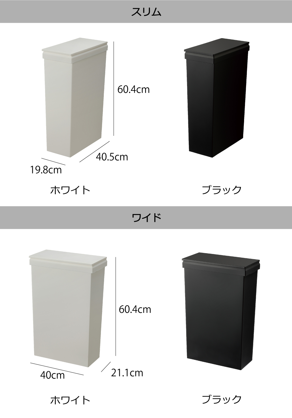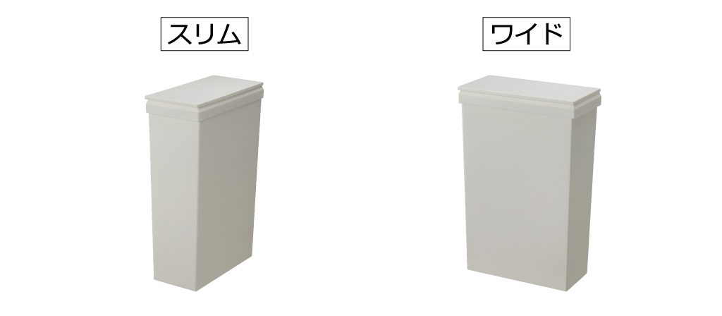 カウンター横や壁際など幅はあるけど奥行きが浅い場所にピッタリな「ワイド」。スリムに比べてフタを開けた時の高さがないので、ラック下などでも開けやすいです。