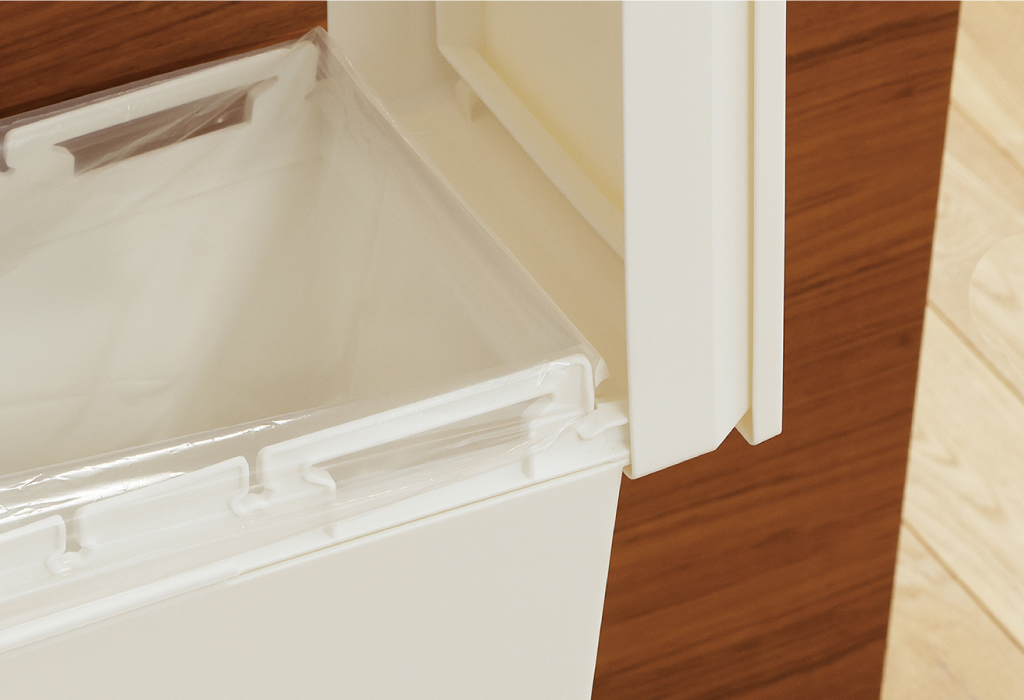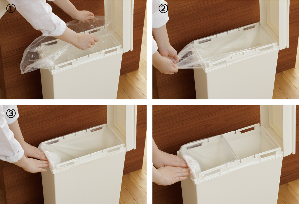 袋はストッパーを使わない、引っ掛けて穴に入れるだけのラクラク取り付け。ストッパーを取り外してゴミ袋を被せる手間が省けます。