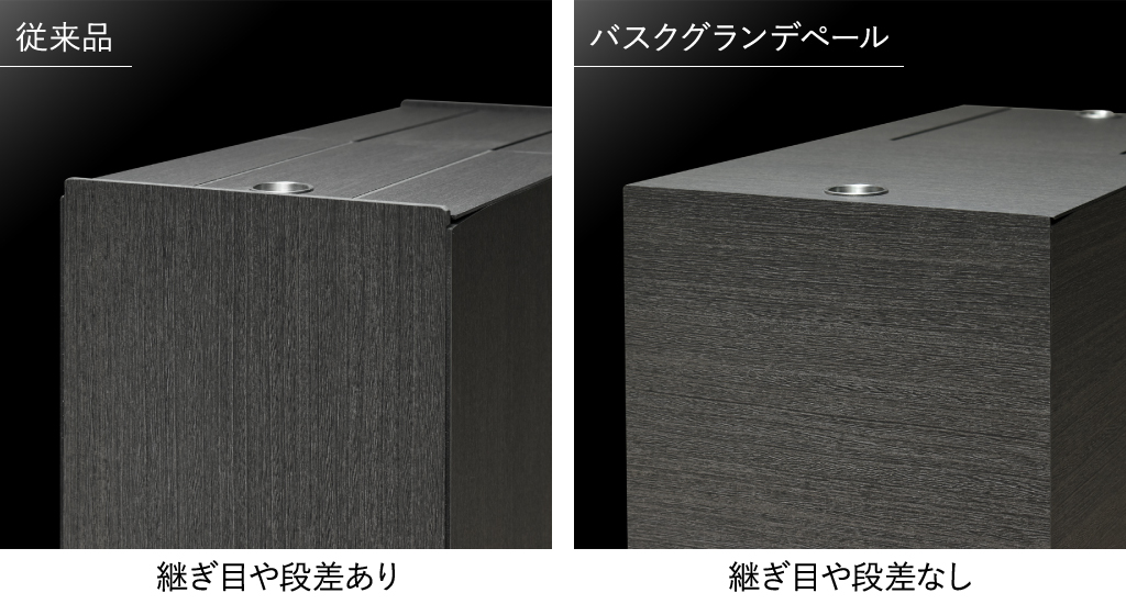 従来品は、接合部に断面部が少し見えておりましたが、グランデは接合する断面が見えない高度な接着方法を用い、横向きの木目模様と相まって継ぎ目感の少ない美しい質感になっております。邪魔になっていたフタ部分の段差も取り除き、よりスタイリッシュになっています。