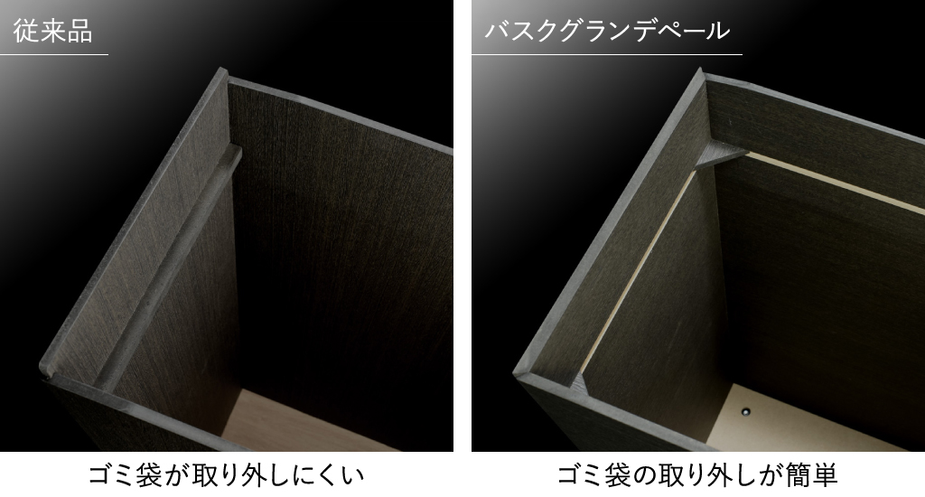 横幅を2cm広くし、袋留めの台座を変更することで、ゴミ袋をより取り外しやすく改良。