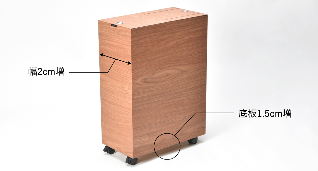 開口の幅を2cmワイド化し、大きめのゴミなども入れやすくなりました。また、底板を1.5cm厚くして強度アップと低重心化で本体が倒れるのを防止しています。