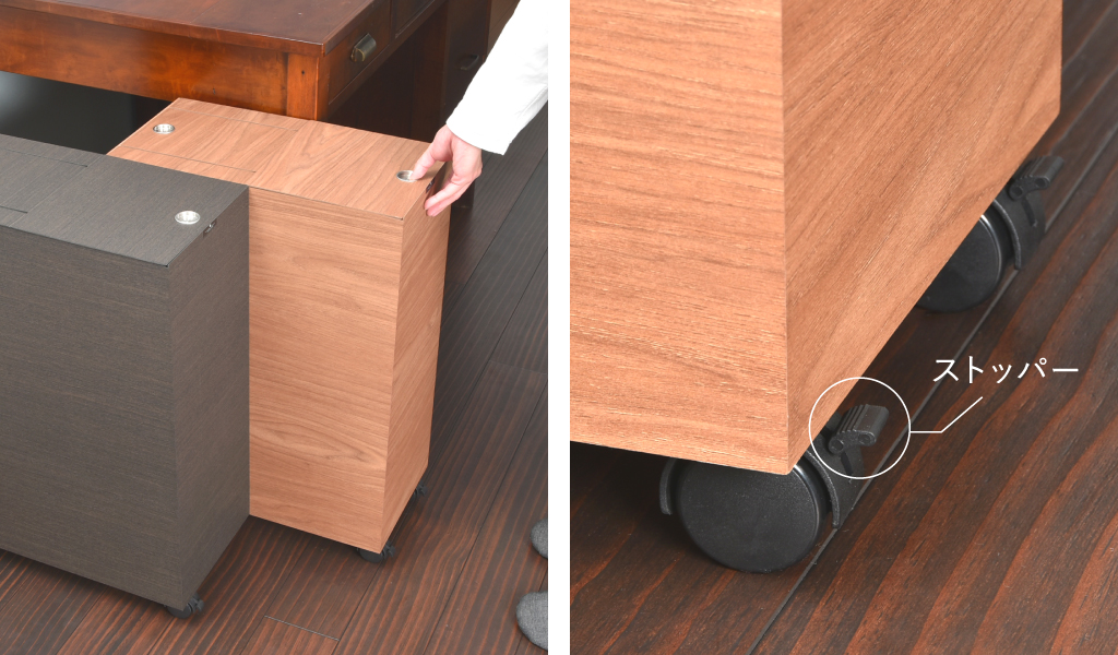 本体底面には移動に便利なキャスターが付いています。掃除の際も簡単に動かすことができます。外から見えにくい位置についているので、本体のデザイン性を損ねる心配もありません。また、ゴミを捨てるたびに動かないよう、前輪のキャスターにはストッパーが新しく付きました。
