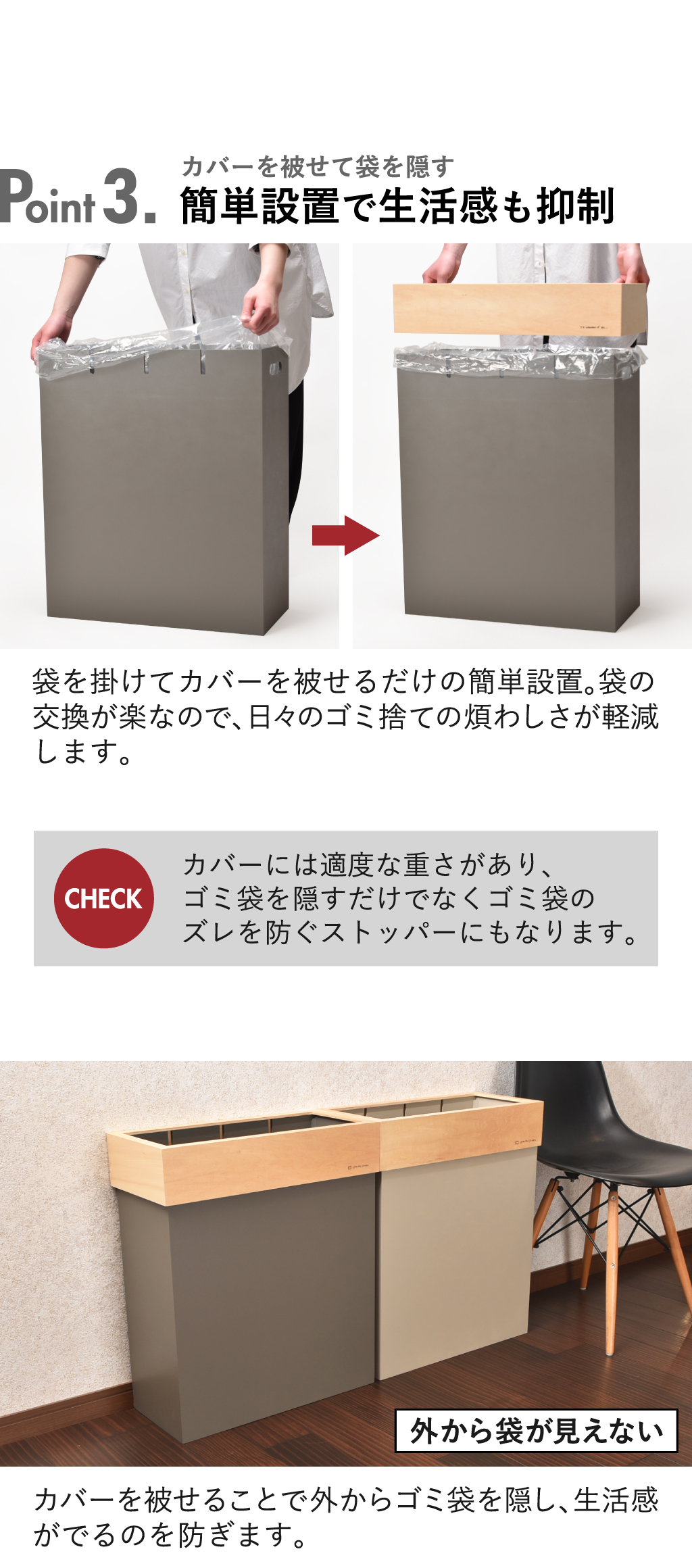 カバーを被せるだけで袋を隠せて、ゴミ箱特有の生活感を消します。