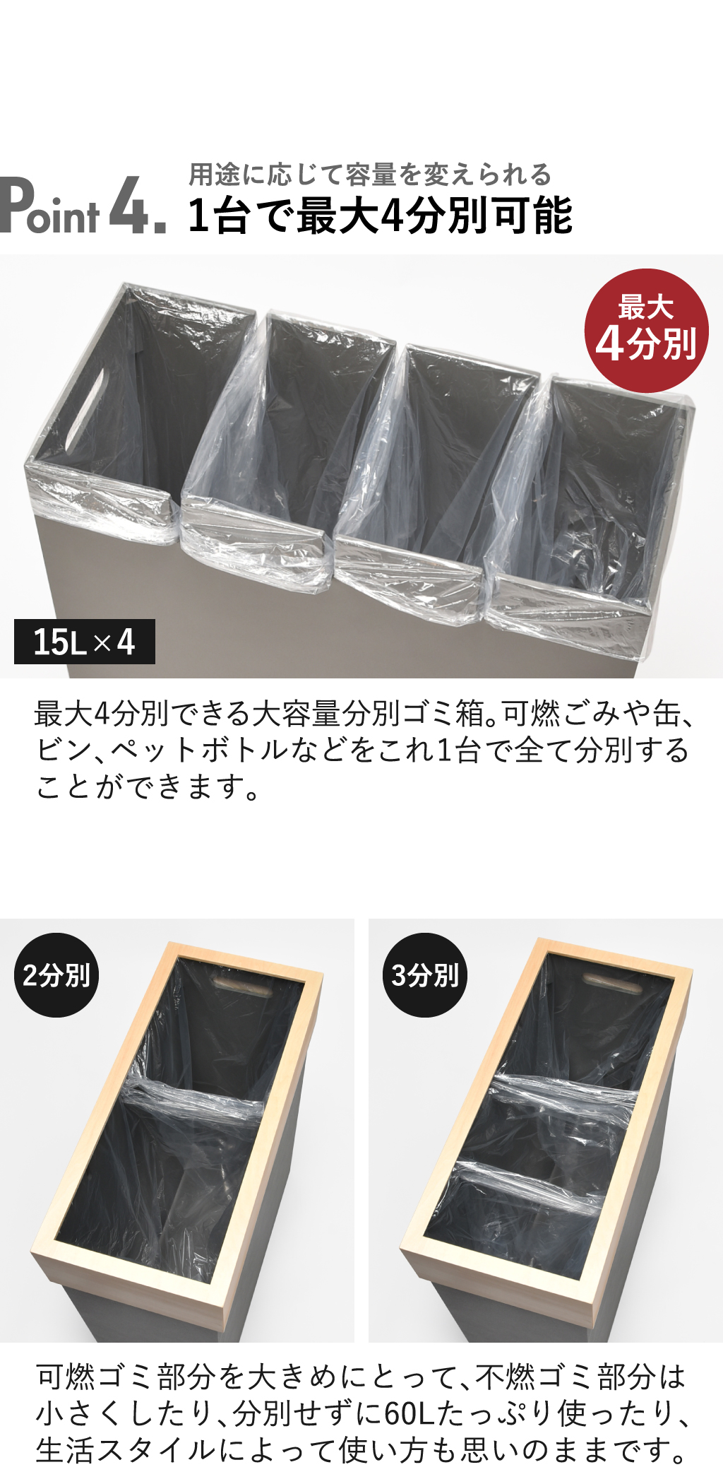 最大4分別できて可燃ごみや缶、ビン、ペットボトルなどこれ一台で全て分別できます。