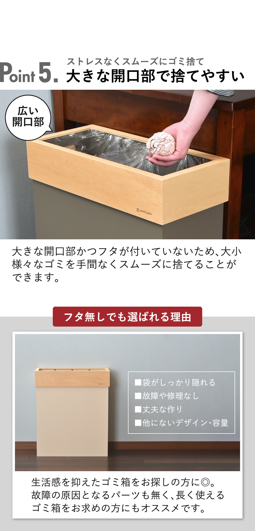 フタが無いため、ゴミ箱の捨て口が広くゴミ捨てもサッと簡単に。