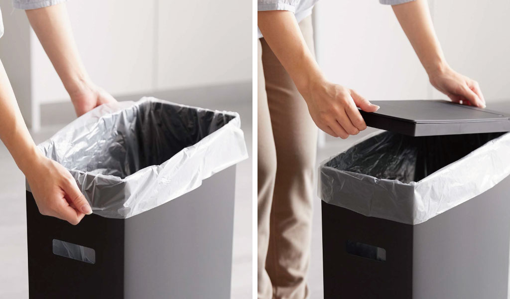 ゴミ袋の取り付けはとても簡単。ゴミ箱本体にゴミ袋を掛けて上からフタを乗せるだけです。