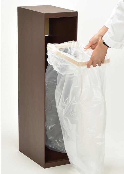 表面からはゴミ袋が見えない設計になっています。また後ろからゴミ袋を設置するので、ペットや小さいお子様のいたずらを防止してくれます。また容量は30Lですが、45Lのゴミ袋を取り付けることができるので、しっかりゴミを回収することができます。